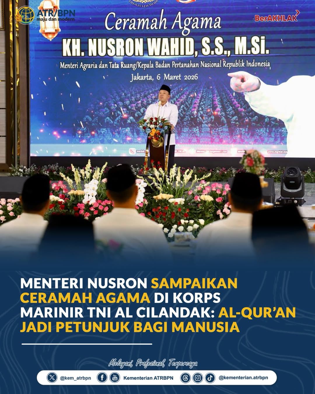 Menteri Agraria dan Tata Ruang/Badan Pertanahan Nasional (ATR/BPN), Nusron Wahid, menyampaikan ceramah agama pada peringatan Nuzulul Quran dan buka puasa bersama prajurit Korps Marinir TNI Angkatan Laut di Gedung Aminullah Ibrahim