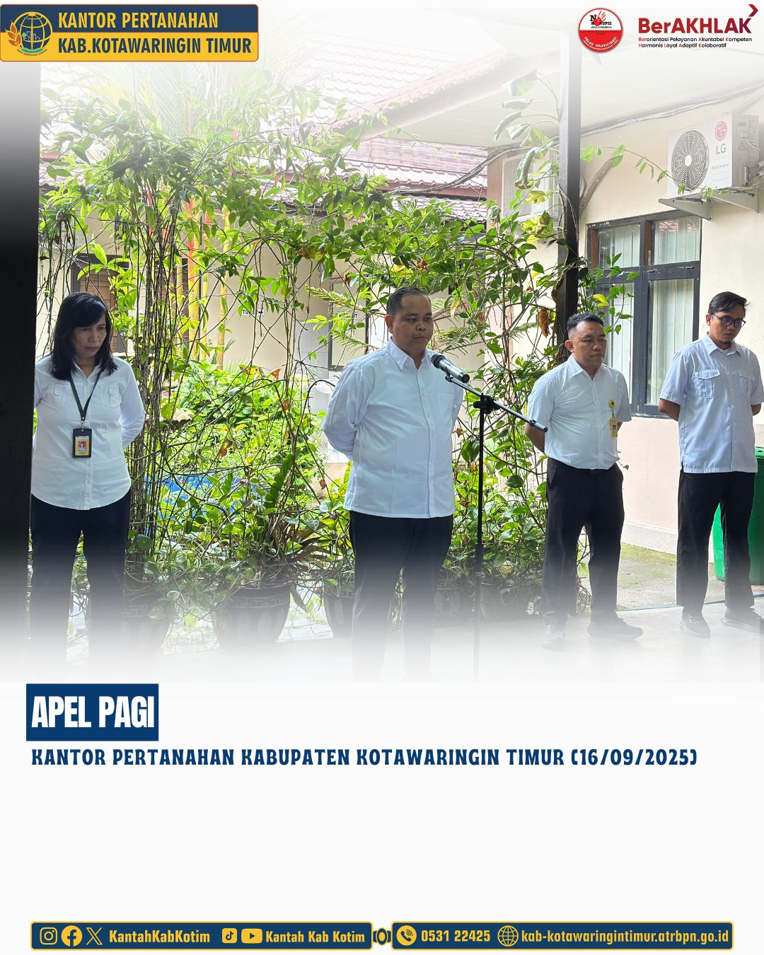 Telah dilaksanakan Apel Pagi Rutin yang dipimpin langsung oleh Bapak Mumin Haryanto, S.H selaku Kepala Kantor Pertanahan Kabupaten Kotawaringin Timur yang diikuti oleh seluruh pegawai Kantor Pertanahan Kabupaten Kotawaringin Timur dan Siswa/i magang.