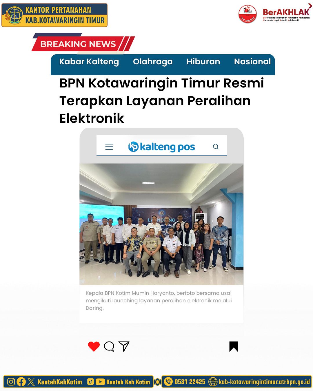 SAMPIT – Badan Pertanahan Nasional (BPN) Kabupaten Kotawaringin Timur (Kotim) resmi meluncurkan layanan peralihan elektronik pada Rabu (24/9/2025). Inovasi tersebut di-launching serentak di 11 kabupaten di Kalimantan Tengah (Kalteng).