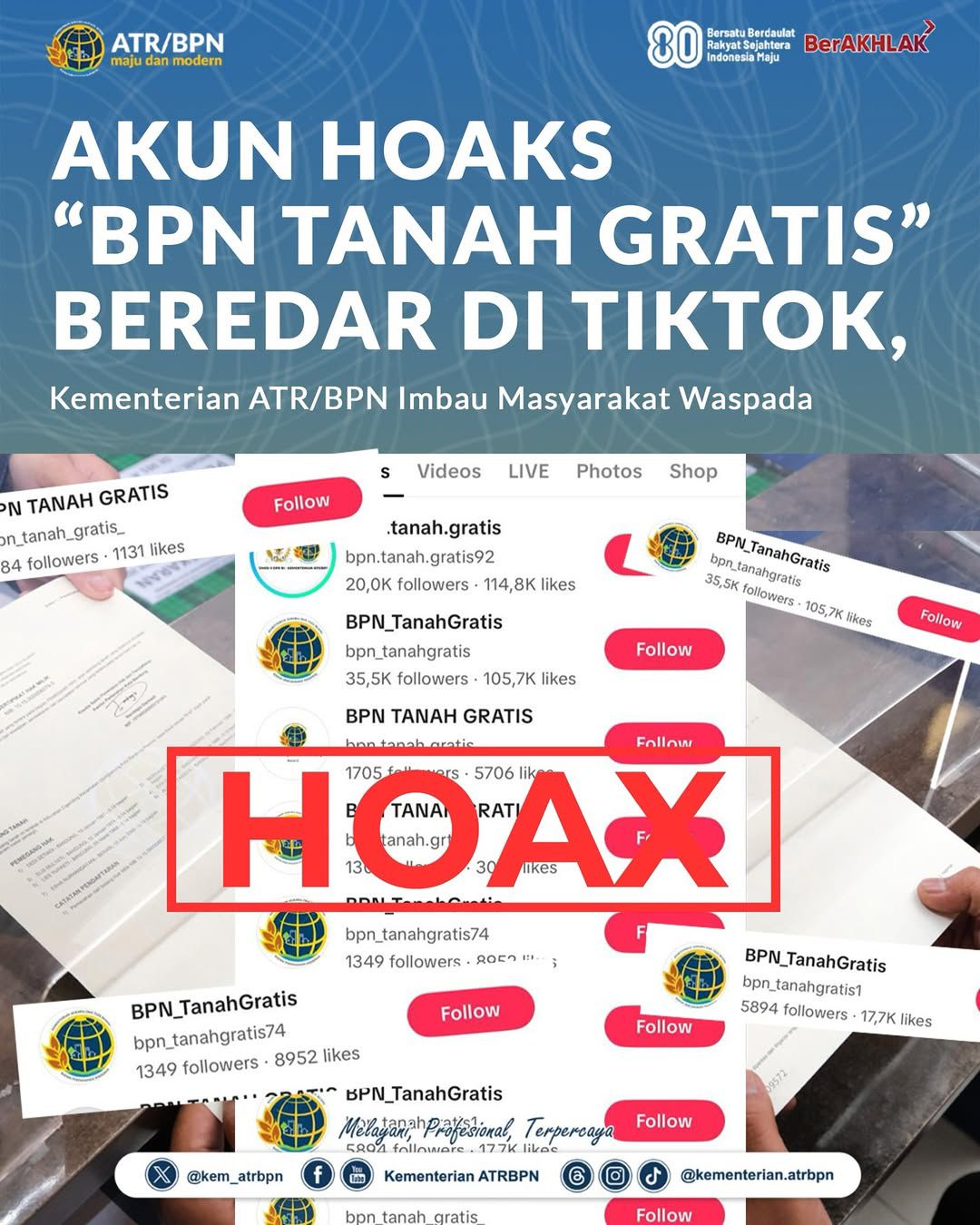 Belakangan beredar informasi di platform TikTok mengenai akun yang menyebarluaskan hoaks “BPN Tanah Gratis”. Akun tersebut mengunggah video yang mengklaim adanya layanan pembuatan sertipikat tanah dan layanan balik nama tanah secara gratis hanya dengan mengklik tautan “daftarsekarang-v11.infokuresmidotcom” pada bio akun tersebut. Kementerian Agraria dan Tata Ruang/Badan Pertanahan Nasional (ATR/BPN) menegaskan bahwa informasi tersebut tidak benar. Tak ada program resmi yang menawarkan sertipikasi maupun balik nama tanah secara gratis, seperti yang disampaikan akun tidak resmi tersebut.