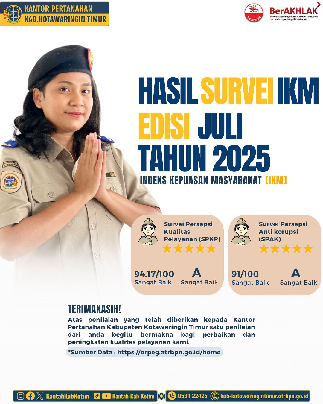 Berikut ini adalah hasil Survei IKM/IPK bulan Juli 2025 pada Kantor Pertanahan Kabupaten Kotawaringin Timur