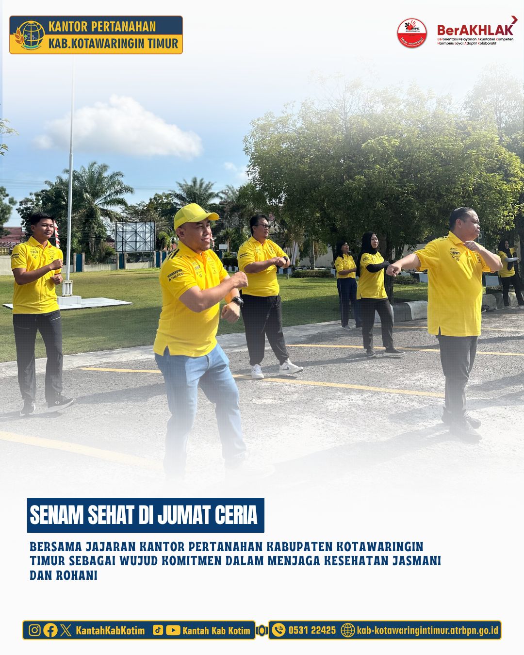 Kantor Pertanahan Kabupaten Kotawaringin Telah melaksanakan keseruan senam sehat di Jumat ceria bersama Jajaran Kantor Pertanahan Kabupaten Kotawaringin Timur sebagai wujud komitmen dalam menjaga kesehatan jasmani dan rohani, sekaligus mempererat kebersamaan antar pegawai.