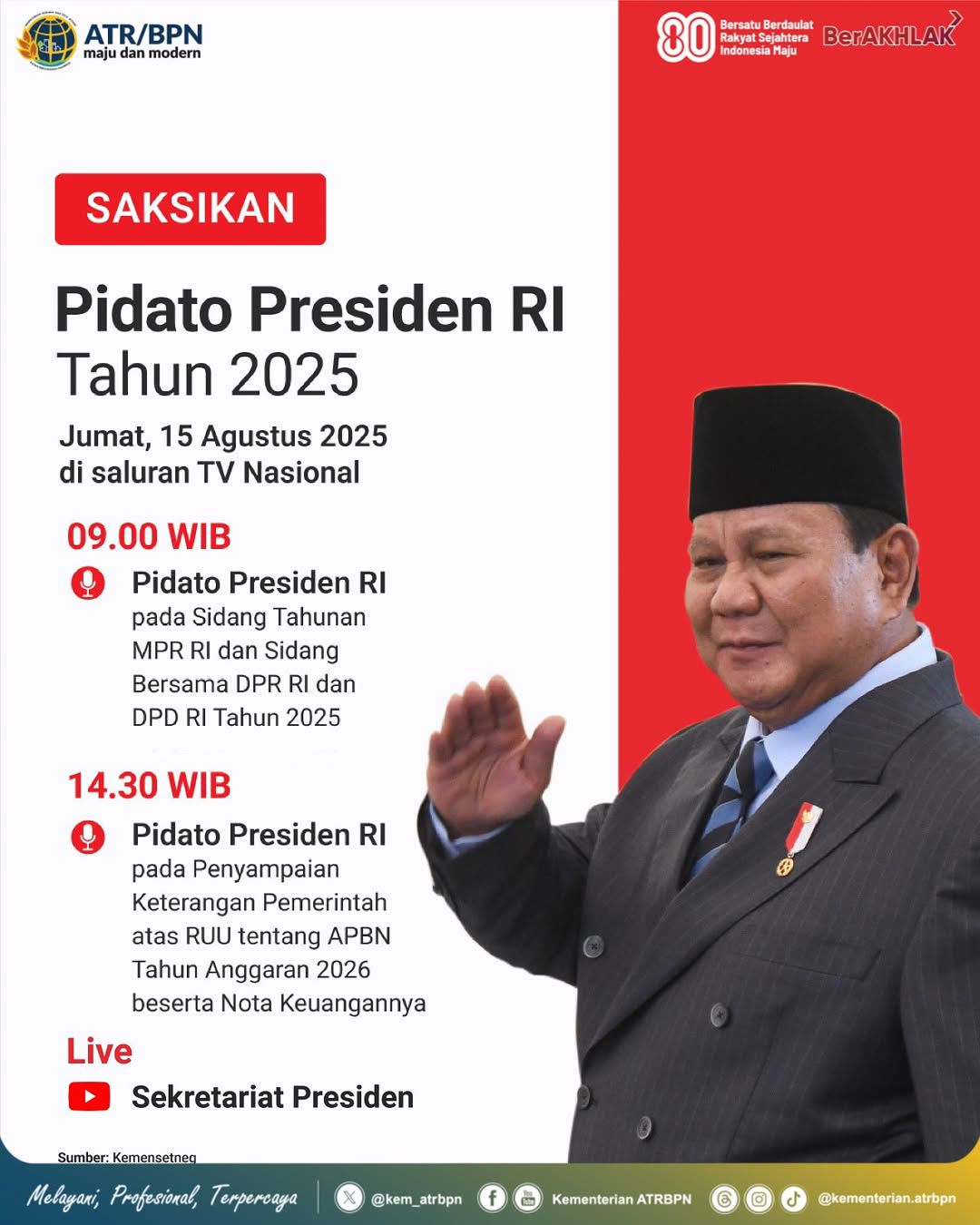 Halo #SobATRBPN, dalam rangkaian perayaan menyambut HUT ke-80 Republik Indonesia, Presiden RI Prabowo Subianto akan menyampaikan Pidato Kenegaraan pada Sidang Tahunan MPR RI dan Sidang Bersama DPR RI dan DPD RI, serta pidato Penyampaian RUU APBN tahun 2026 beserta nota keuangannya.