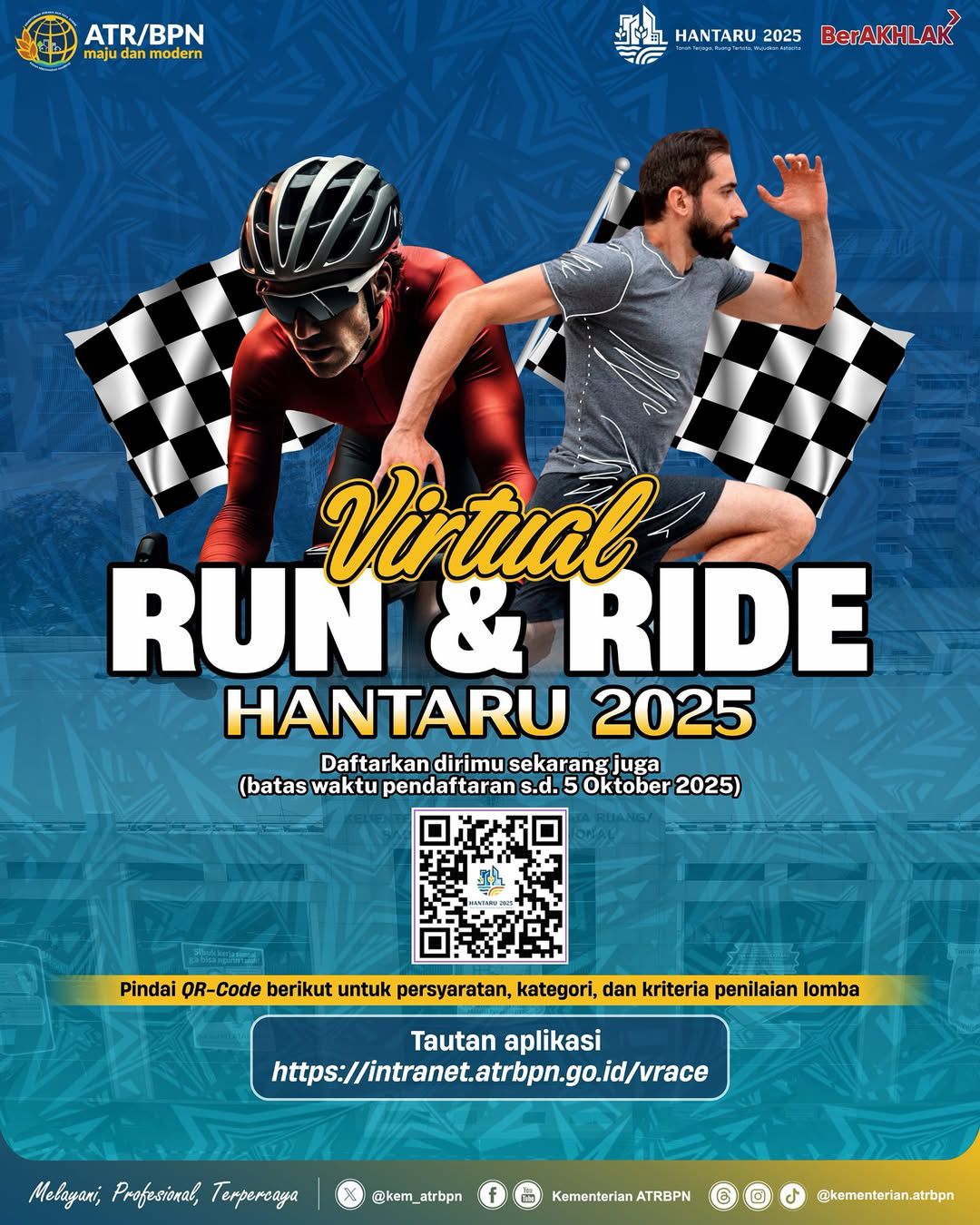 Halo #SobATRBPN, dalam rangkaian peringatan Hari Agraria dan Tata Ruang Nasional (HANTARU) 2025, Kementerian ATR/BPN akan mengadakan Virtual Run & Ride khusus pegawai Kementerian ATR/BPN.