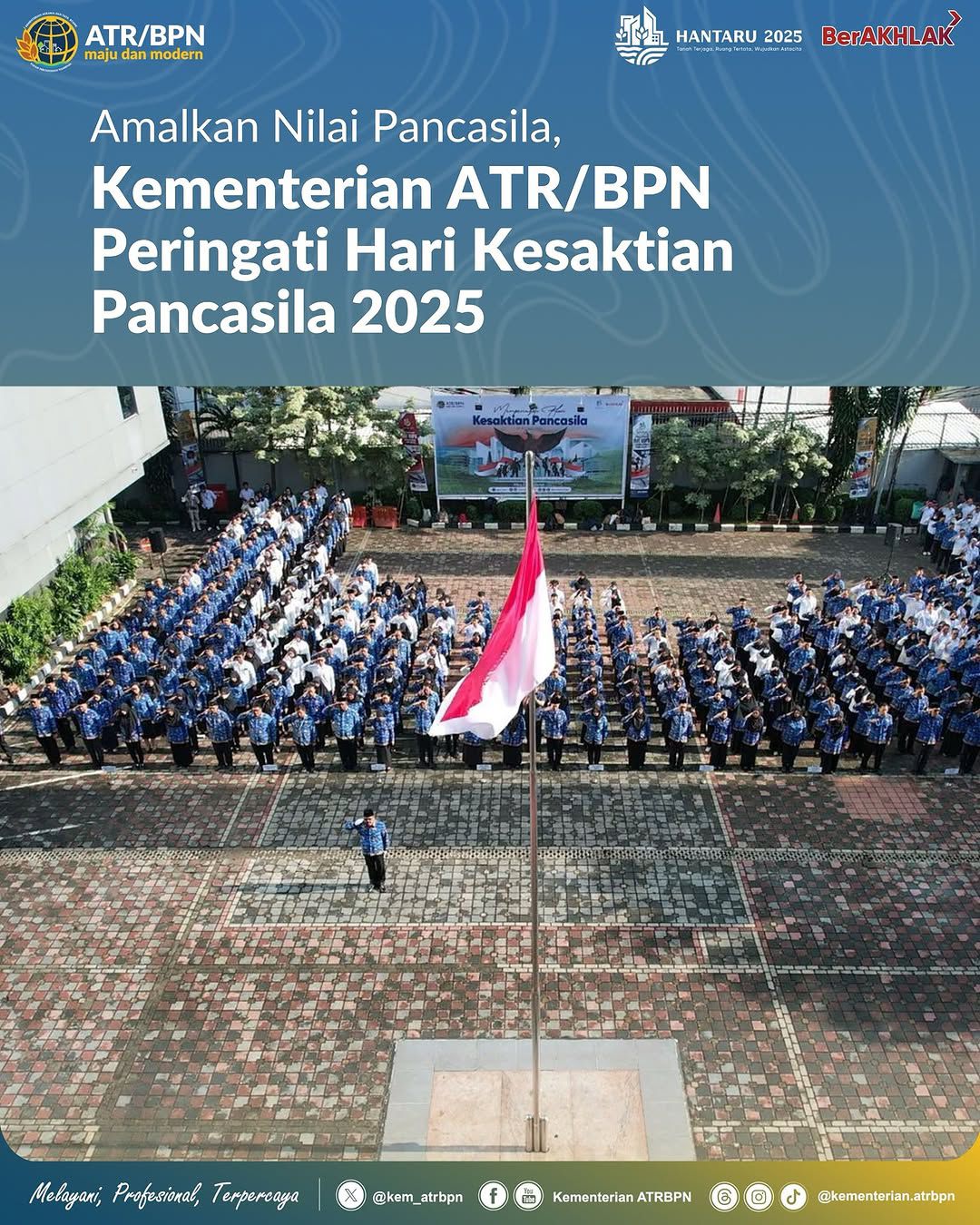 Dalam semangat memperkokoh komitmen untuk mengamalkan nilai-nilai Pancasila di kehidupan berbangsa dan bernegara, Kementerian Agraria dan Tata Ruang/Badan Pertanahan Nasional (ATR/BPN) menggelar Upacara Peringatan Hari Kesaktian Pancasila Tahun 2025, di Lapangan Upacara Kementerian ATR/BPN, Jakarta, Rabu (01/10/2025). Bertindak sebagai inspektur upacara, Direktur Jenderal Pengadaan Tanah dan Pengembangan Pertanahan (Dirjen PTPP), Embun Sari.