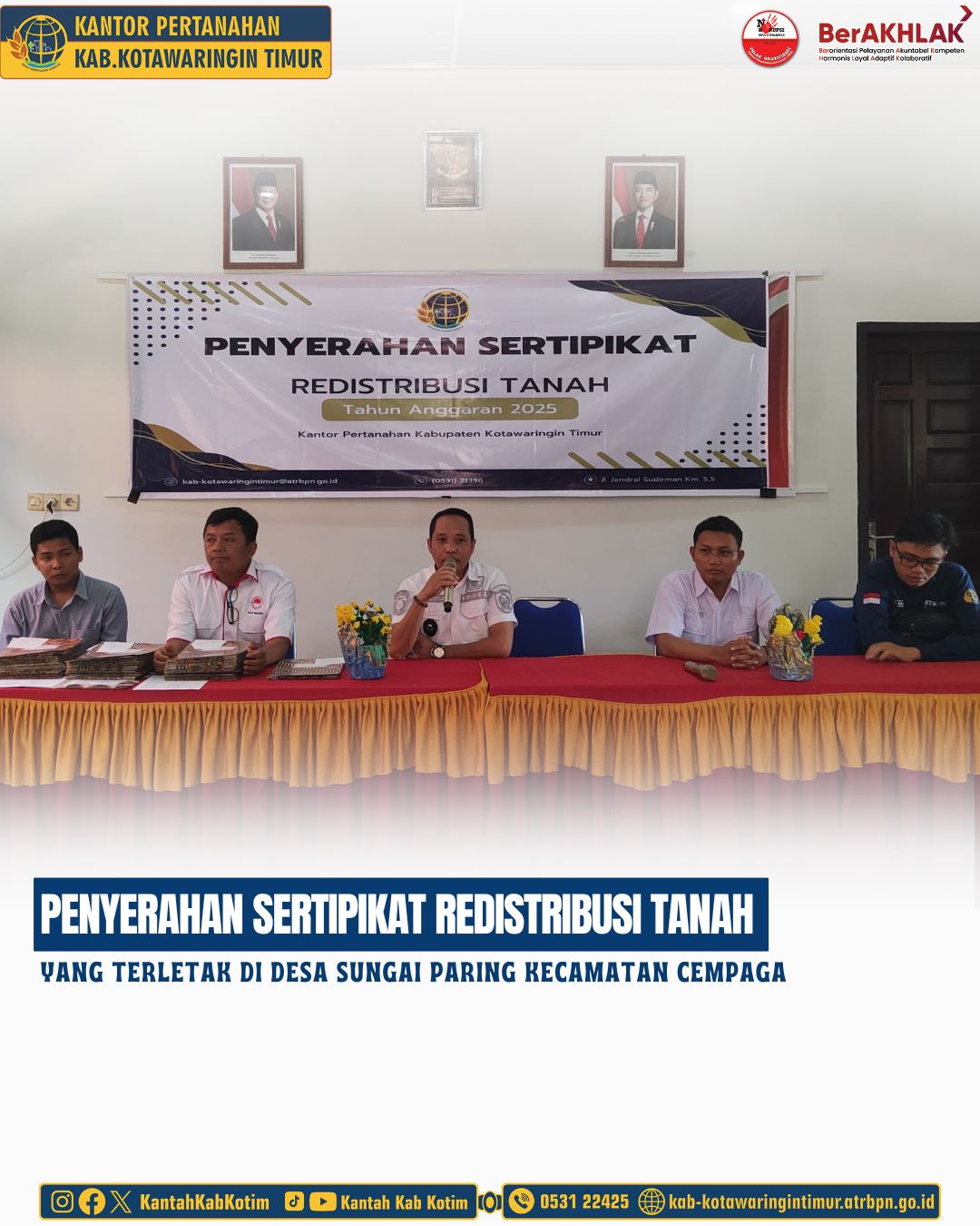 Telah dilaksanakan penyerahan sertipikat Redistribusi Tanah tahun 2025 di Sungai Paring Kecamatan Cempaga sebanyak 131 Sertipikat yang berasal dari objek Pelepasan Kawasan Hutan (Inver PPTKH) SK 214/MENLHK/SETJEN/PLA.2/3/2023 dan Tanah Negara Dikuasai Masyarakat.