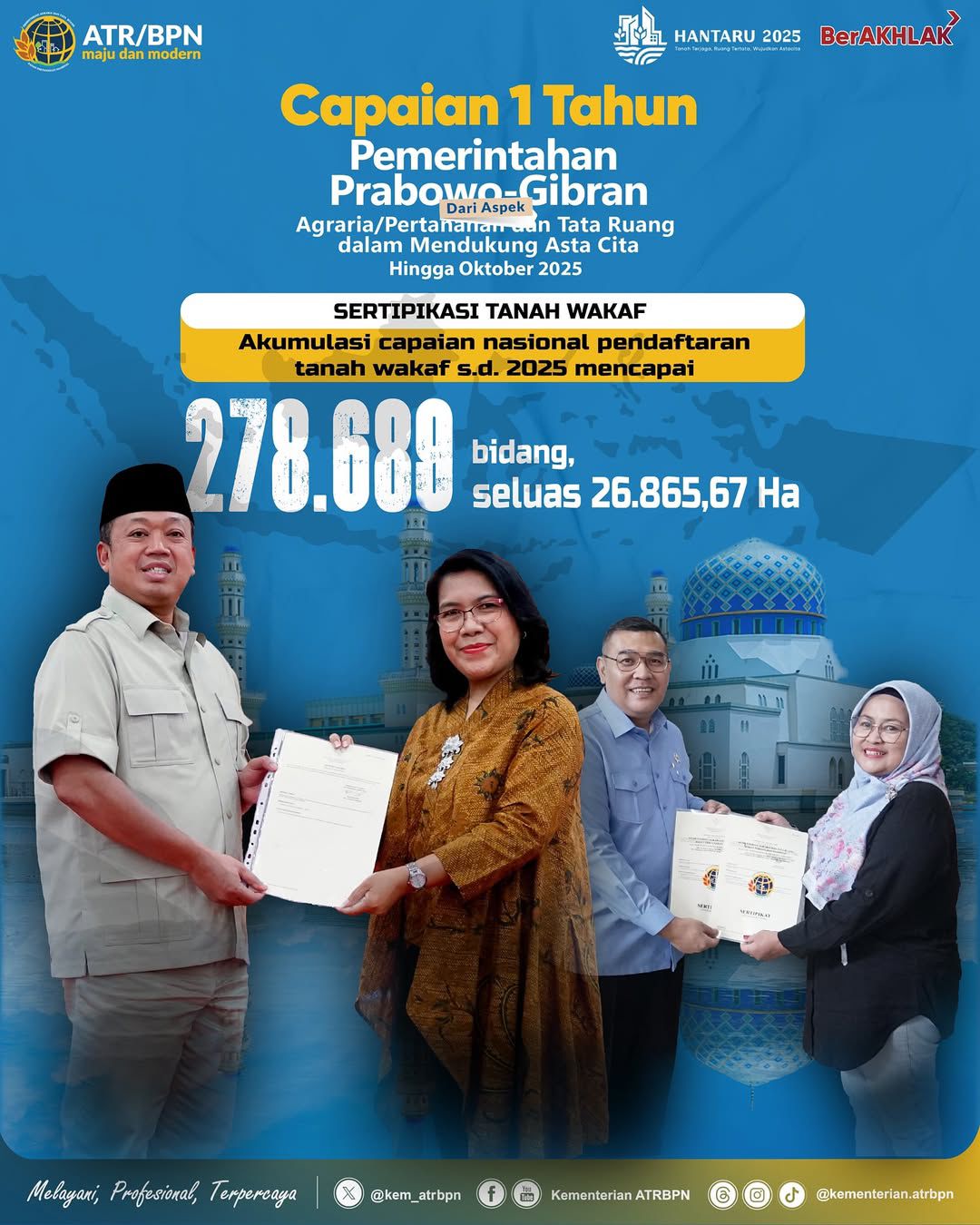 Nah, tentunya Kementerian ATR/BPN juga ikut berperan dalam sektor pertanahan dan tata ruang dengan mendaftarkan tanah-tanah wakaf.