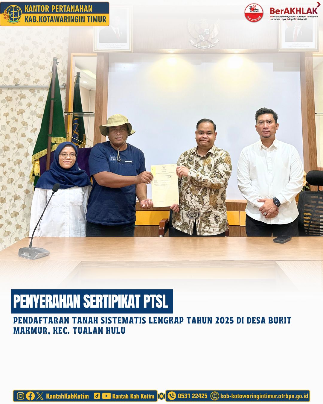 Kantor Pertanahan Kabupaten Kotawaringin Telah melaksanakan Penyerahan sertipikat Pendaftaran Tanah Sistematis Lengkap (PTSL) Tahun 2025 di Desa Bukit Makmur, Kecamatan Tualan Hulu, Kabupaten Kotawaringin Timur.