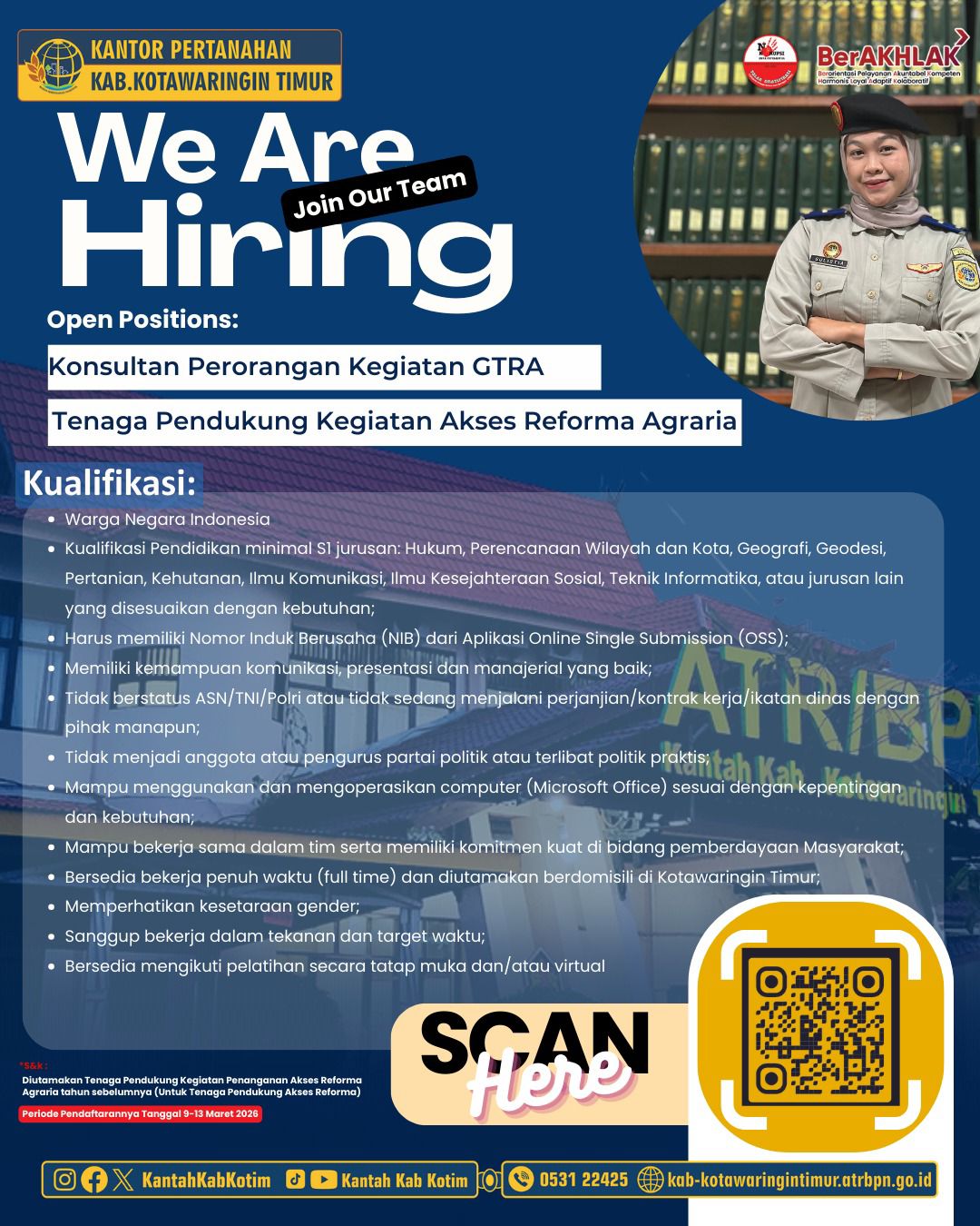 Kantor Pertanahan Kabupaten Kotawaringin Timur membuka kesempatan untuk bergabung bersama Kantor Pertanahan Kabupaten Kotawaringin timur sebagai Konsultan Perorangan Kegiatan Data GTRA dan Tenaga Pendukung Kegiatan Akses Reforma Agraria