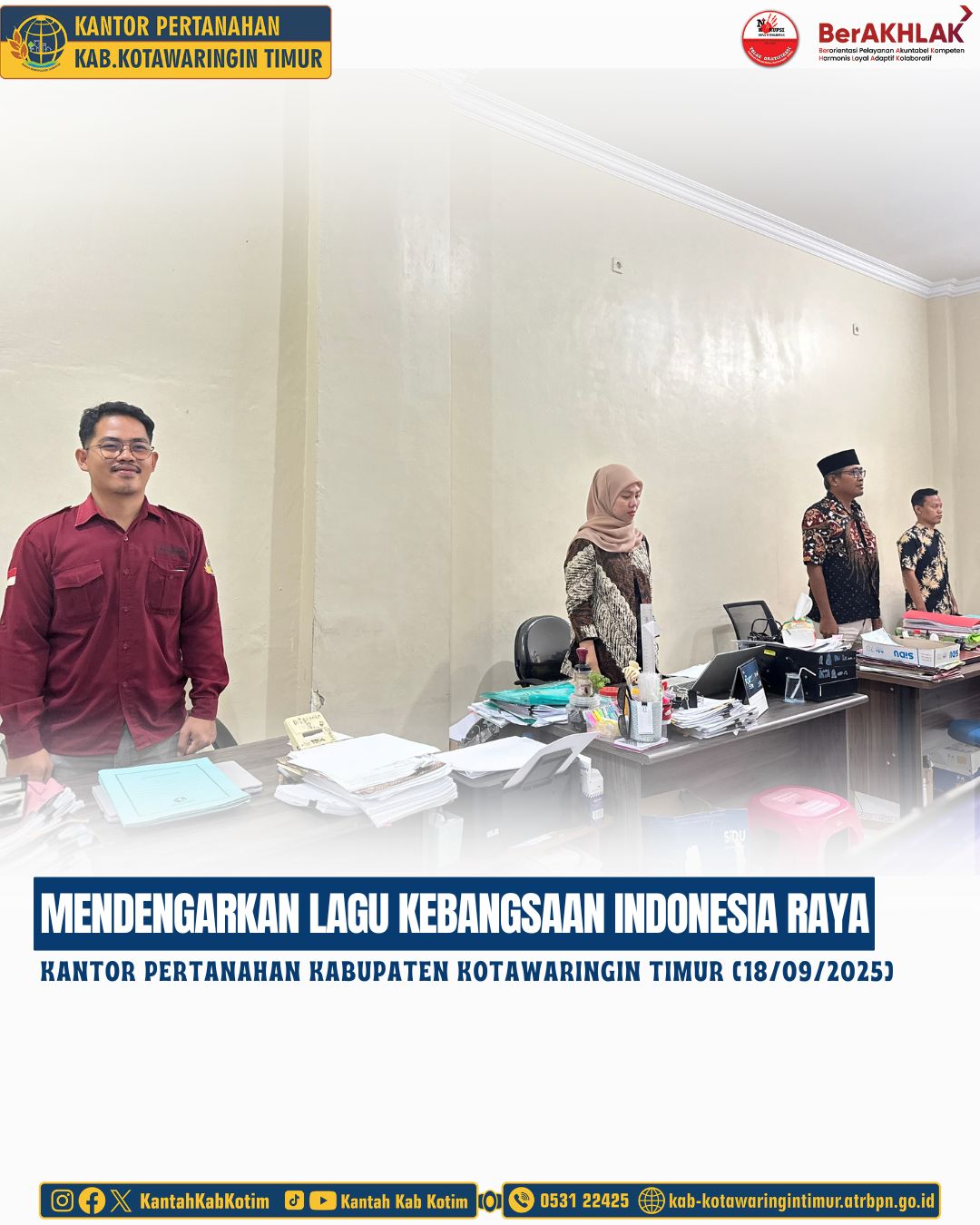Kantor Pertanahan Kabupaten Kotawaringin Timur telah melaksanakan giat Mendengarkan Lagu Indonesia Raya yang diikuti oleh seluruh jajaran pegawai Kantor Pertanahan Kabupaten Kotawaringin Timur dengan posisi berdiri tegak mengambil sikap sempurna pada ruangan kerja masing-masing