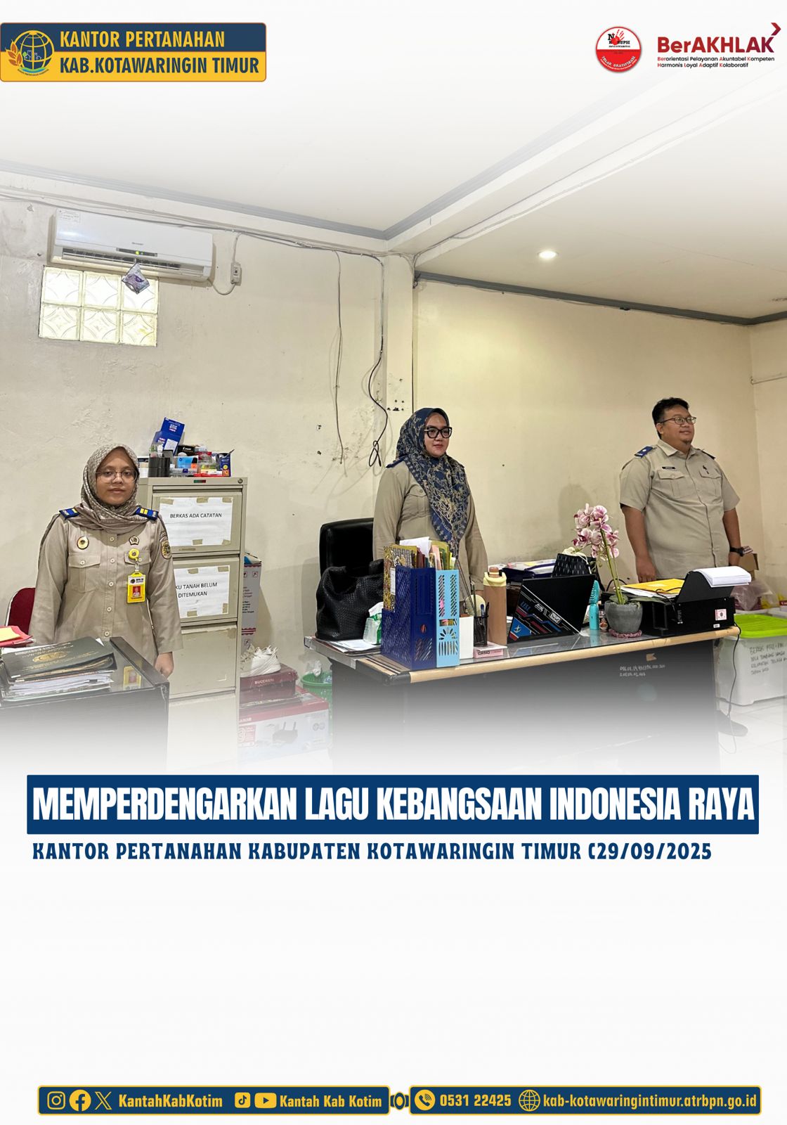 Kantor Pertanahan Kabupaten Kotawaringin Timur telah melaksanakan giat Mendengarkan Lagu Indonesia Raya yang diikuti oleh seluruh jajaran pegawai Kantor Pertanahan Kabupaten Kotawaringin Timur dengan posisi berdiri tegak mengambil sikap sempurna pada ruangan kerja masing-masing