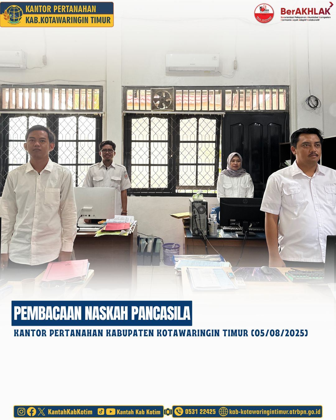 Kantor Pertanahan Kabupaten Kotawaringin Timur telah melaksanakan giat Pembacaan Naskah Panca Prasetya Korpri yang diikuti oleh seluruh jajaran pegawai Kantor Pertanahan Kabupaten Kotawaringin Timur dengan posisi berdiri tegak mengambil sikap sempurna pada ruangan kerja masing-masing
