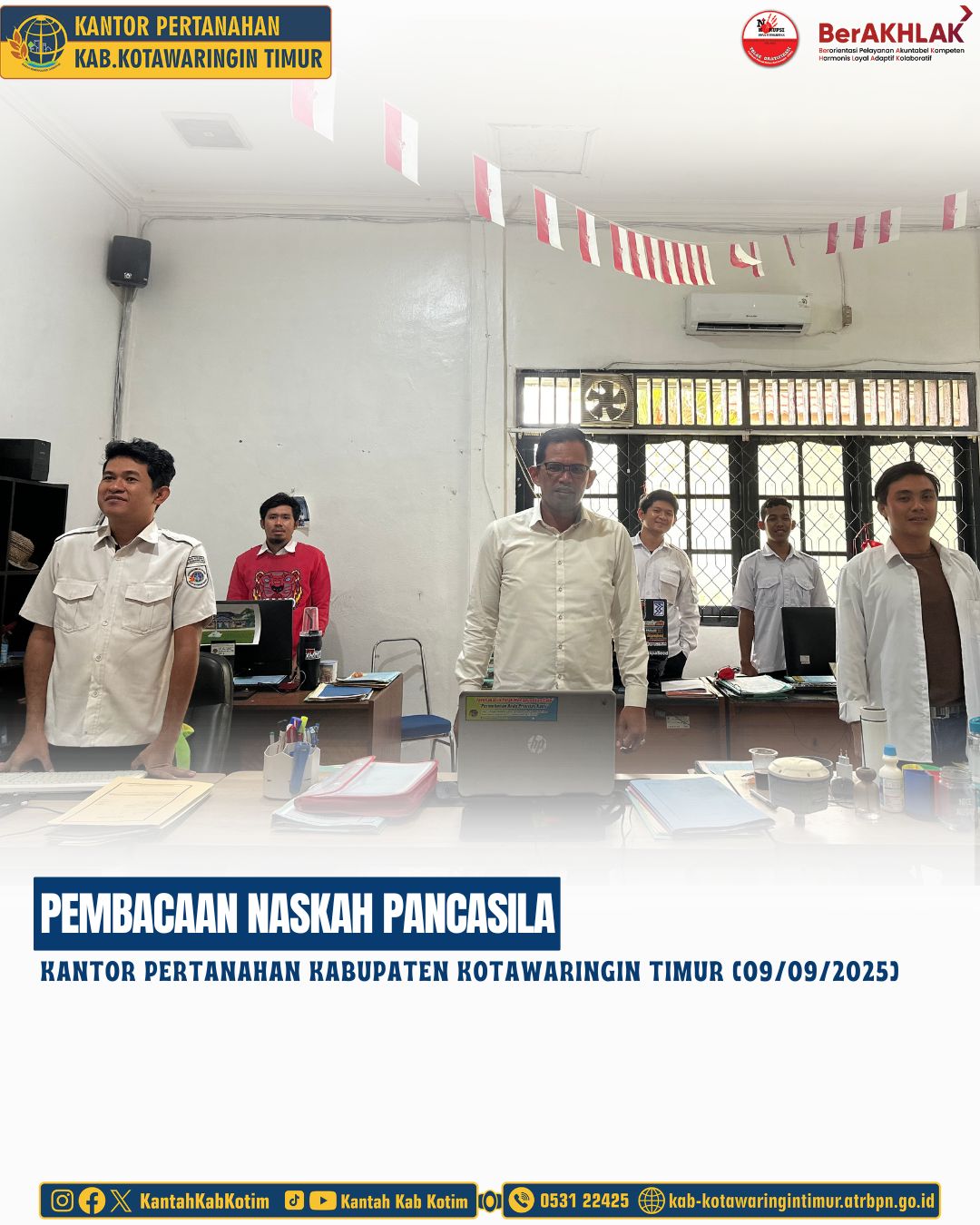 Kantor Pertanahan Kabupaten Kotawaringin Timur telah melaksanakan giat Pembacaan Naskah Pancasila yang diikuti oleh seluruh jajaran pegawai Kantor Pertanahan Kabupaten Kotawaringin Timur dengan posisi berdiri tegak mengambil sikap sempurna pada ruangan kerja masing-masing (09/09/2025)