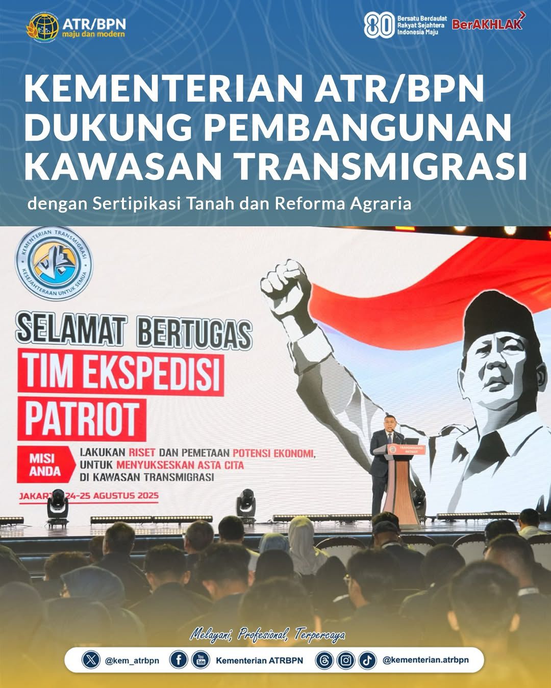 Kementerian Agraria dan Tata Ruang/Badan Pertanahan Nasional (ATR/BPN) ikut mendukung pertumbuhan pembangunan dan ekonomi di kawasan transmigrasi sesuai dengan visi misi Asta Cita melalui beberapa program strategis bersama Kementerian Transmigrasi. Hal ini disampaikan oleh Wakil Menteri (Wamen) ATR/Wakil Kepala (Waka) BPN, Ossy Dermawan, saat menyampaikan materi dalam Pembekalan dan Pelepasan Tim Ekspedisi Patriot, di Balai Kartini, Jakarta, Senin (25/08/2025).