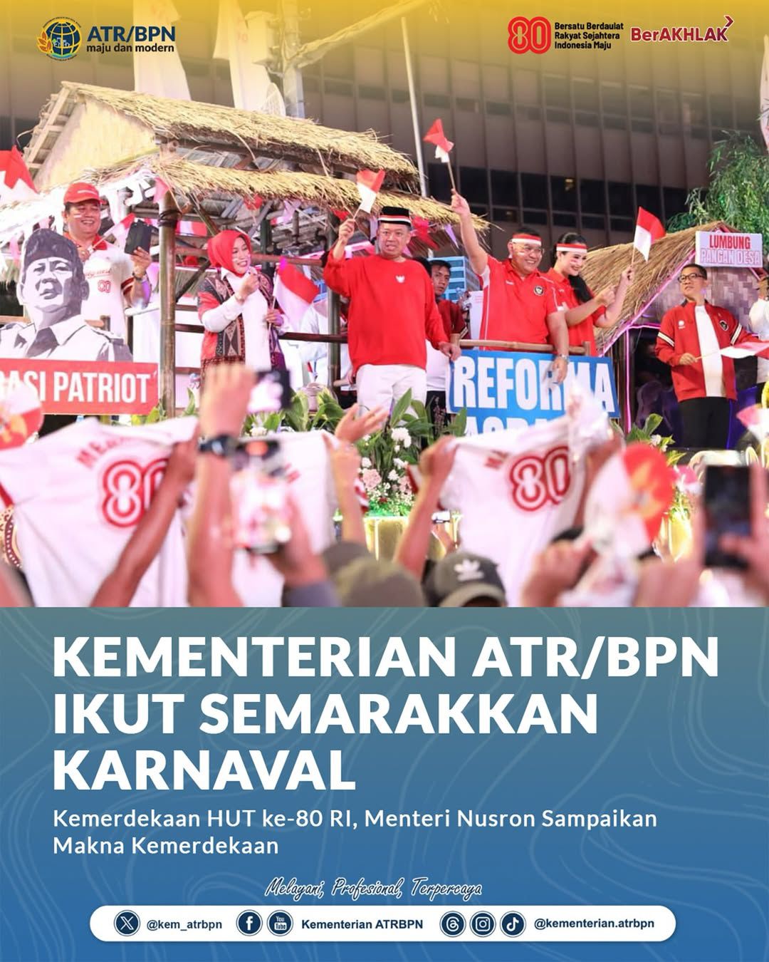 Kementerian Agraria dan Tata Ruang/Badan Pertanahan Nasional (ATR/BPN) turut berpartisipasi dalam Karnaval Kemerdekaan HUT ke-80 Republik Indonesia (RI) pada Minggu (17/08/2025) malam. Dari atas kendaraan hias, Menteri ATR/Kepla BPN, Nusron Wahid, yang juga didampingi Wakil Menteri ATR/Wakil Kepala BPN, Ossy Dermawan, mengutarakan pandangannya tentang makna kemerdekaan.