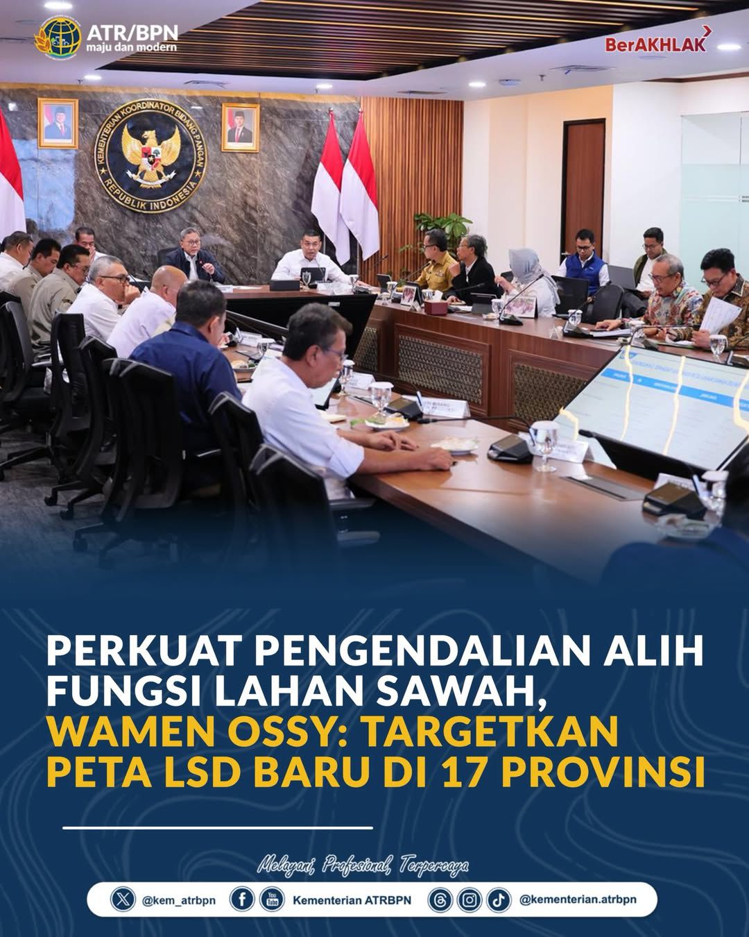 Halo #SobATRBPN, Kementerian Agraria dan Tata Ruang/Badan Pertanahan Nasional terus memperkuat pengendalian alih fungsi lahan sawah melalui penetapan Lahan Sawah yang Dilindungi (LSD). Wakil Menteri ATR/Waka BPN, Ossy Dermawan, menyampaikan bahwa setelah menyiapkan LSD di 12 provinsi, pemerintah menargetkan penyusunan peta luasan LSD di 17 provinsi lainnya rampung pada kuartal II 2026, dengan target pertengahan Juni 2026, dalam Rakortas di Jakarta, Senin (30/03/2026).