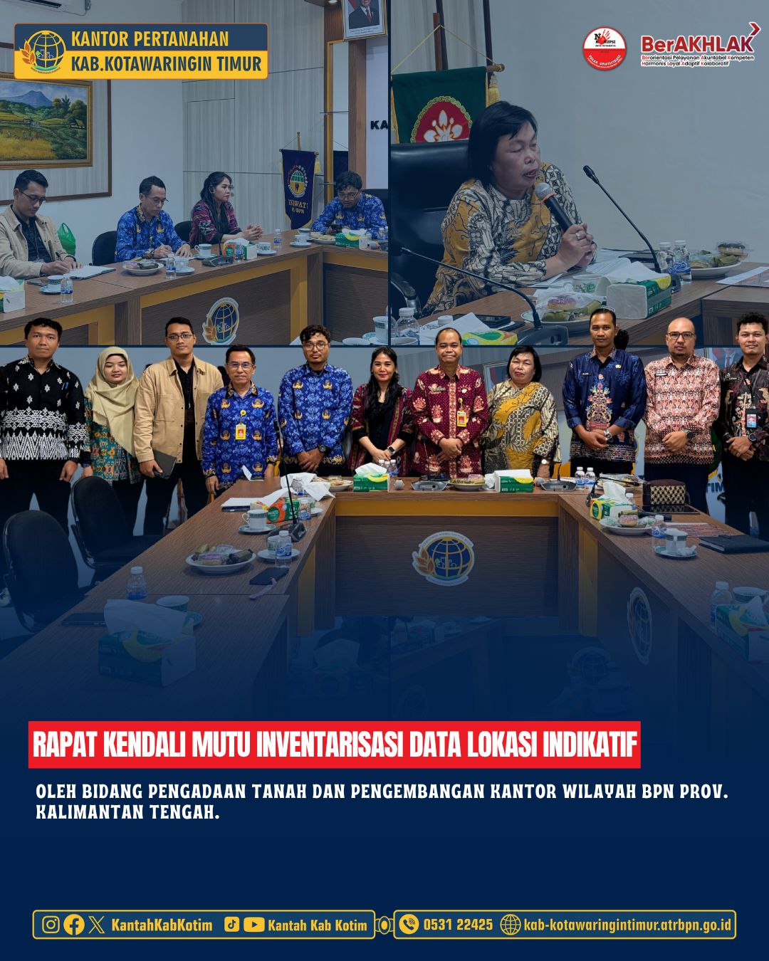 Kepala Kantor pertanahan Kabupaten Kotawaringin Timur Bapak Mumin Haryanto, S.H beserta Pejabat Pengawas telah melaksanakan kegiatan Rapat Kendali Mutu Inventarisasi Data Lokasi Indikatif oleh Bidang Pengadaan Tanah dan Pengembangan Kantor Wilayah BPN Prov. Kalimantan Tengah.