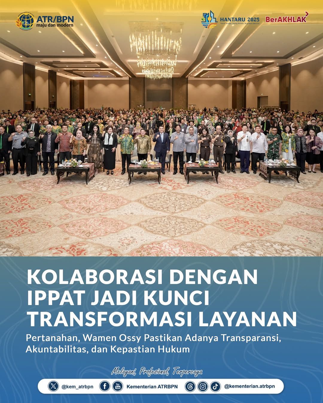 Wakil Menteri Agraria dan Tata Ruang/Wakil Kepala Badan Pertanahan Nasional (Wamwn ATR/Waka BPN), Ossy Dermawan, menegaskan pentingnya kolaborasi antara Kementerian ATR/BPN dan Ikatan Pejabat Pembuat Akta Tanah (IPPAT) dalam mempercepat transformasi layanan pertanahan di Indonesia. Ia menyatakan hal itu saat menjadi pembicara kunci dalam Seminar Pengurus Wilayah (Pengwil) Jawa Timur IPPAT, di Dyandra Convention Center, Surabaya, Senin (22/09/2025).