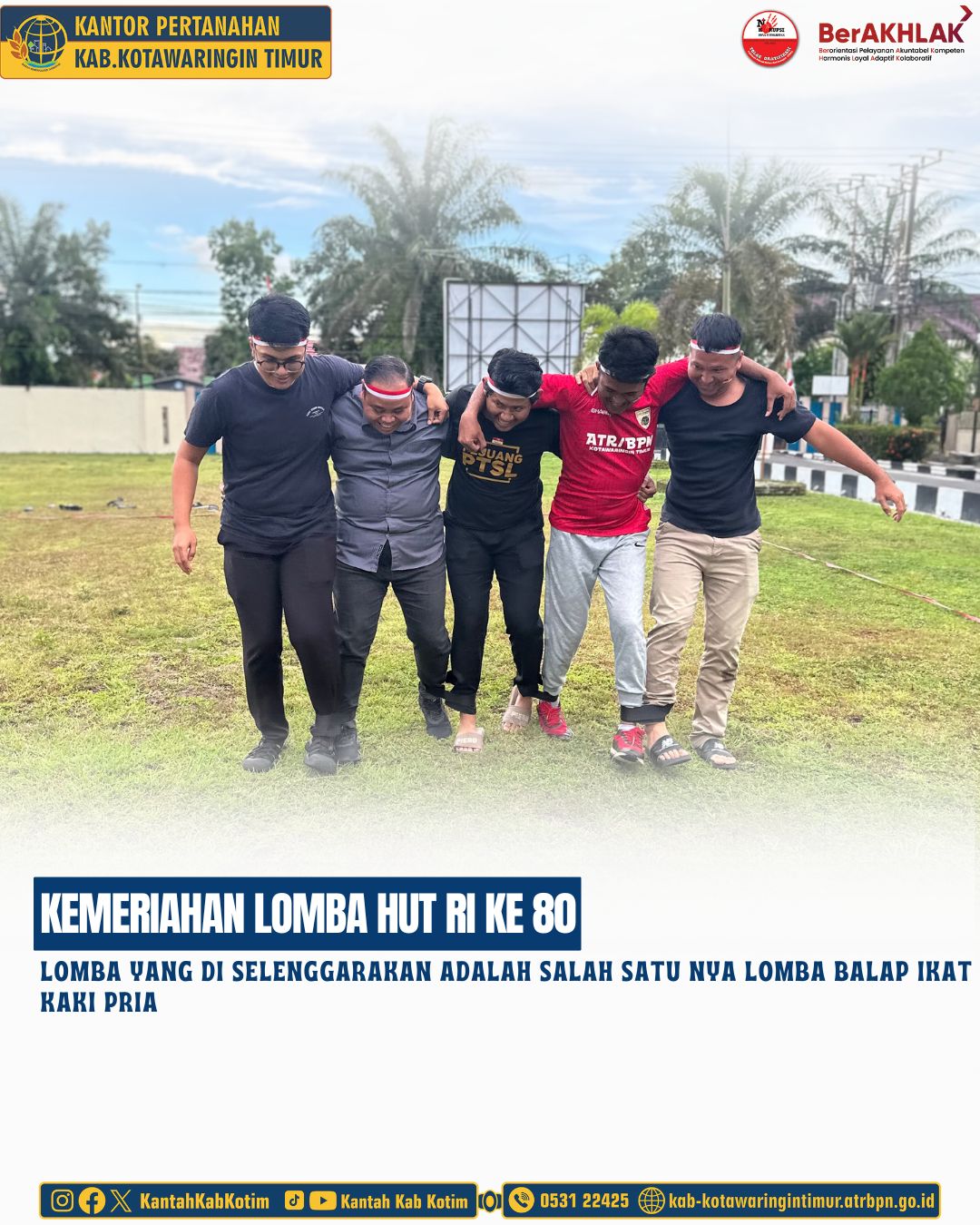 Dalam rangka Hari Ulang Tahun ke-80 Republik Indonesia, Kantor Pertanahan Kabupaten Kotawaringin Timur menyelenggarakan kegiatan semarak kemerdekaan yang berlangsung meriah di lingkungan kantor. Kegiatan ini tidak hanya menjadi momentum memperingati hari bersejarah bangsa, tetapi juga sebagai ajang mempererat tali silaturahmi dan kekompakan di antara seluruh jajaran pegawai.