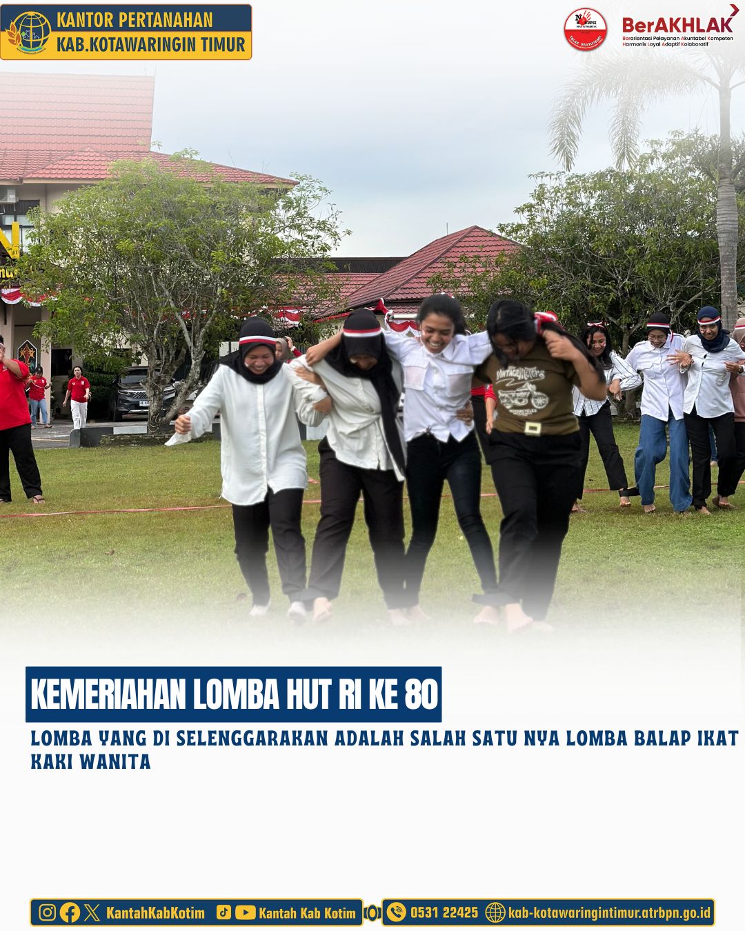 Dalam rangka Hari Ulang Tahun ke-80 Republik Indonesia, Kantor Pertanahan Kabupaten Kotawaringin Timur menyelenggarakan kegiatan semarak kemerdekaan yang berlangsung meriah di lingkungan kantor. Kegiatan ini tidak hanya menjadi momentum memperingati hari bersejarah bangsa, tetapi juga sebagai ajang mempererat tali silaturahmi dan kekompakan di antara seluruh jajaran pegawai.