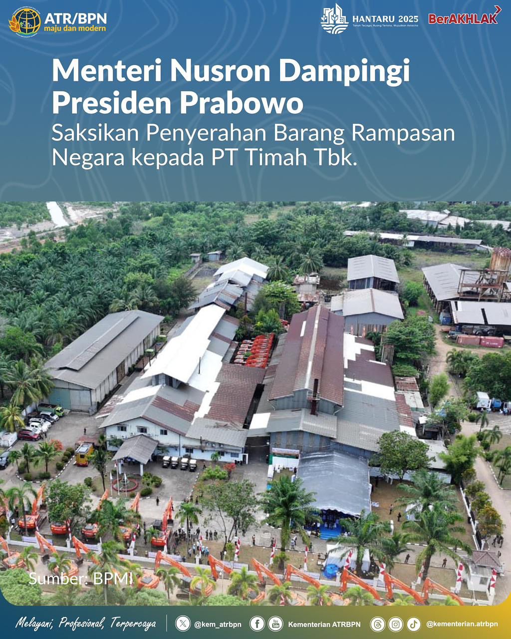 Menteri Agraria dan Tata Ruang/Kepala Badan Pertanahan Nasional (ATR/BPN), Nusron Wahid, bersama sejumlah Menteri/Kepala Lembaga Kabinet Merah Putih mendampingi Presiden Republik Indonesia, Prabowo Subianto, dalam acara penyerahan aset barang rampasan negara. Kegiatan ini berlangsung di PT Tinindo Internusa, Pulau Bangka pada Senin (06/10/2025).