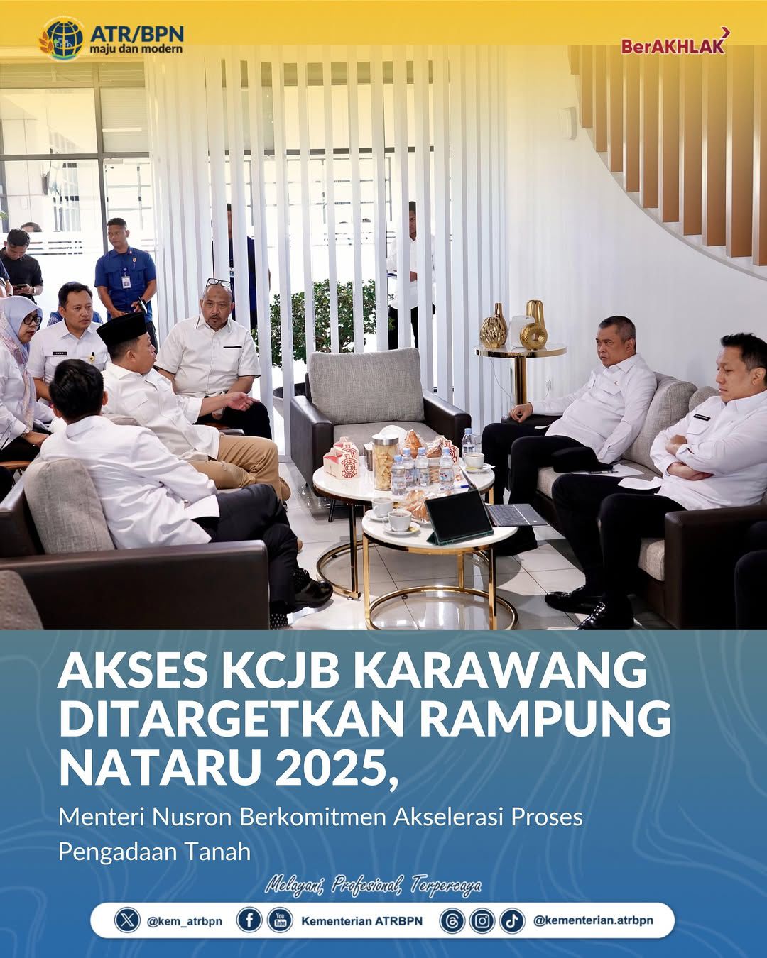 Menteri Agraria dan Tata Ruang/Kepala Badan Pertanahan Nasional (ATR/BPN), Nusron Wahid, menghadiri Rapat Koordinasi Percepatan Pembangunan Akses Stasiun Kereta Cepat Jakarta–Bandung (KCJB) Karawang yang digelar di Stasiun KCJB Karawang, pada Kamis (18/09/2025). Rapat ini membahas percepatan pembangunan akses jalan menuju Stasiun KCJB Karawang sebagai bagian dari upaya peningkatan aksesibilitas transportasi publik.