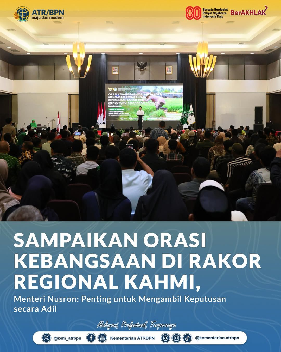 Menteri Agraria dan Tata Ruang/Kepala Badan Pertanahan Nasional (ATR/BPN), Nusron Wahid, menyampaikan orasi kebangsaan dalam Rapat Koordinasi (Rakor) Regional Korps Alumni Himpunan Mahasiswa Islam (KAHMI), di Kota Ternate, Sabtu (23/08/2025). Dalam orasinya, ia menegaskan pentingnya menggunakan keadilan sebagai dasar dalam setiap kebijakan, khususnya terkait pengelolaan tanah nasional.