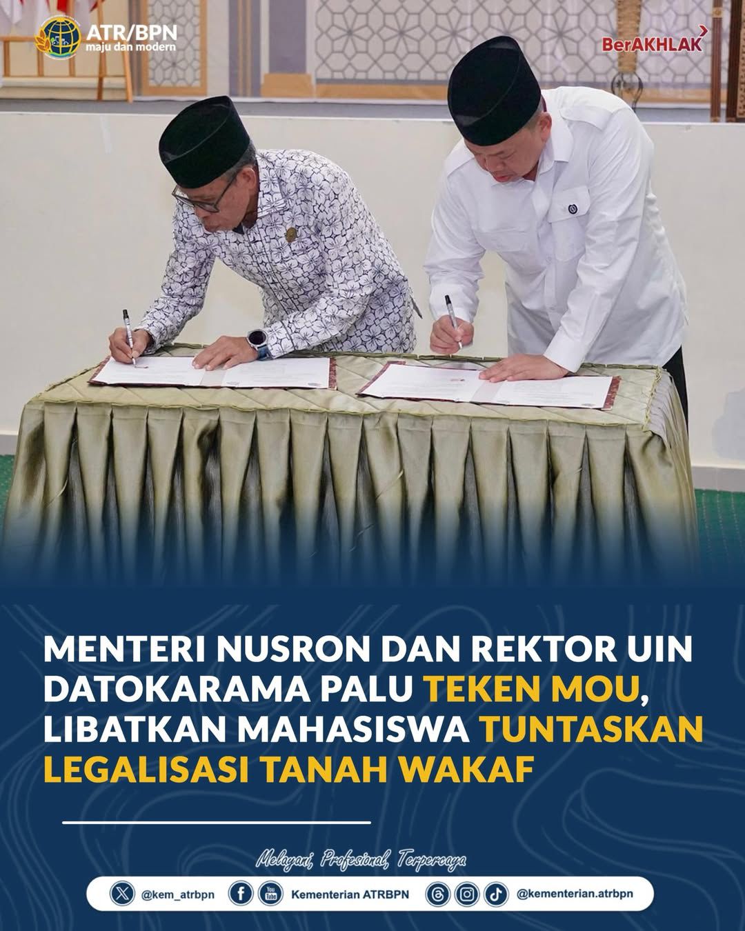 Halo #SobATRBPN, Menteri Agraria dan Tata Ruang/Kepala BPN, Nusron Wahid, bersama Rektor Universitas Islam Negeri (UIN) Datokarama Palu, Lukman S. Thahir, menandatangani Nota Kesepahaman (MoU) terkait pelaksanaan KKN Tematik di bidang pertanahan, Rabu (01/04/2026). Kerja sama ini menjadi langkah konkret dalam melibatkan mahasiswa untuk membantu percepatan legalisasi tanah wakaf.