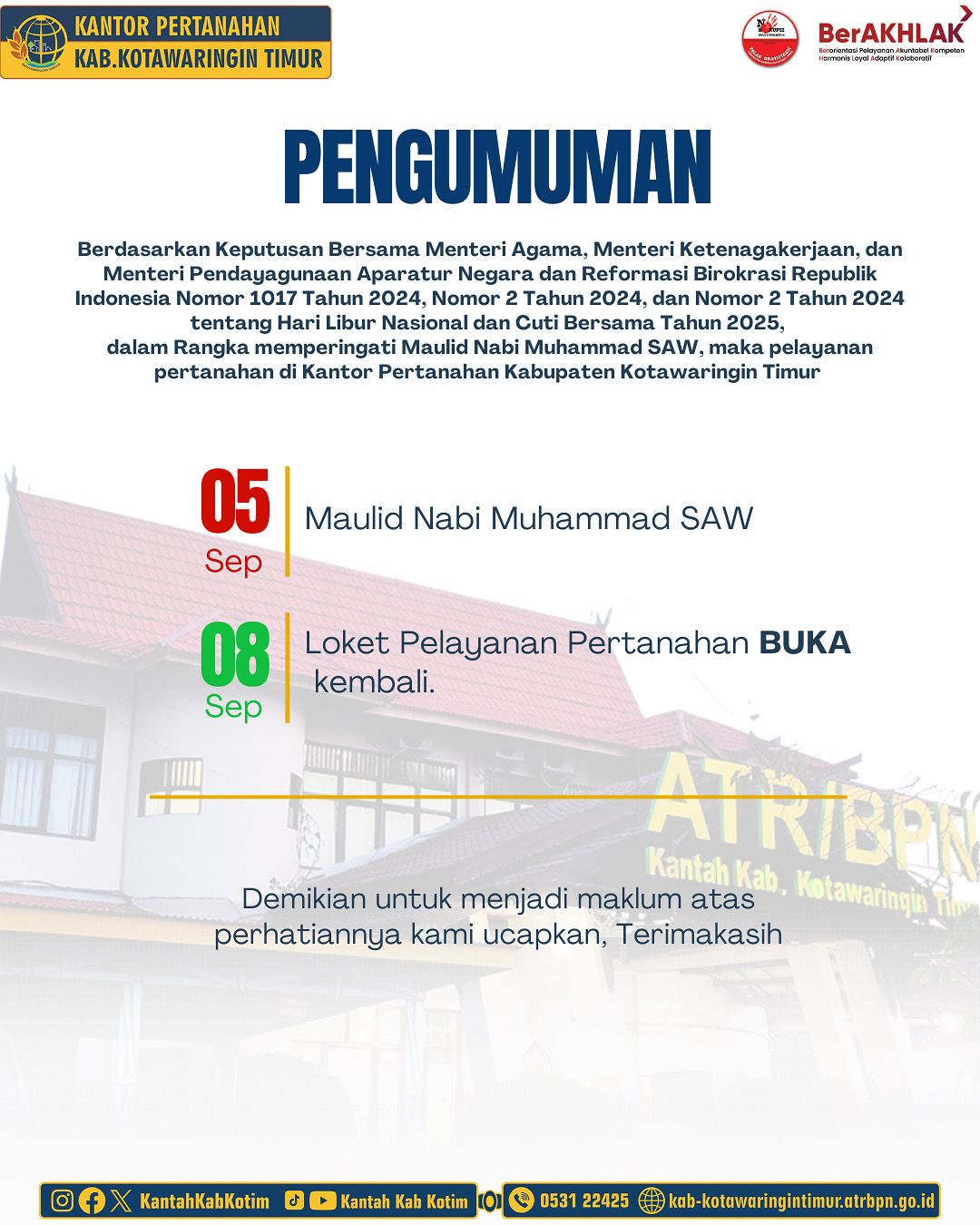 Pendayagunaan Aparatur Negara dan Reformasi Birokrasi Nomor 1017 Tahun 2024, Nomor 2 Tahun 2024 dan Nomor 2 Tahun 2024 Tentang Hari Libur Nasional dan Cuti Bersama Tahun 2025, dengan ini disampaikan bahwa Kantor Pertanahan Kabupaten Kotawaringin Timur akan libur dalam rangka memperingati Maulid Nabi Muhammad SAW pada tanggal 05 September 2025