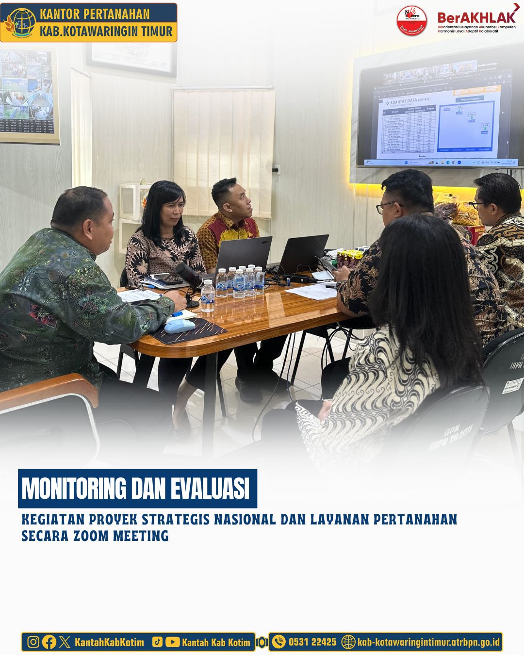 Kepala Kantor Pertanahan Kabupaten Kotawaringin Timur beserta seluruh Pejabat Pengawas mengikuti Rapat Monitoring dan Evaluasi Kegiatan PSN dan Layanan Pertanahan secara Zoom Meeting yang dipimpin Ibu Kepala Kantor Wilayah Badan Pertanahan Nasional Provinsi Kalimantan Tengah (Dr. Ir. Fitriyani Hasibuan, Dipl.Ph., M.M) diikuti oleh seluruh Kantor Pertanahan Kabupaten/ Kota se-Kalimantan Tengah.
