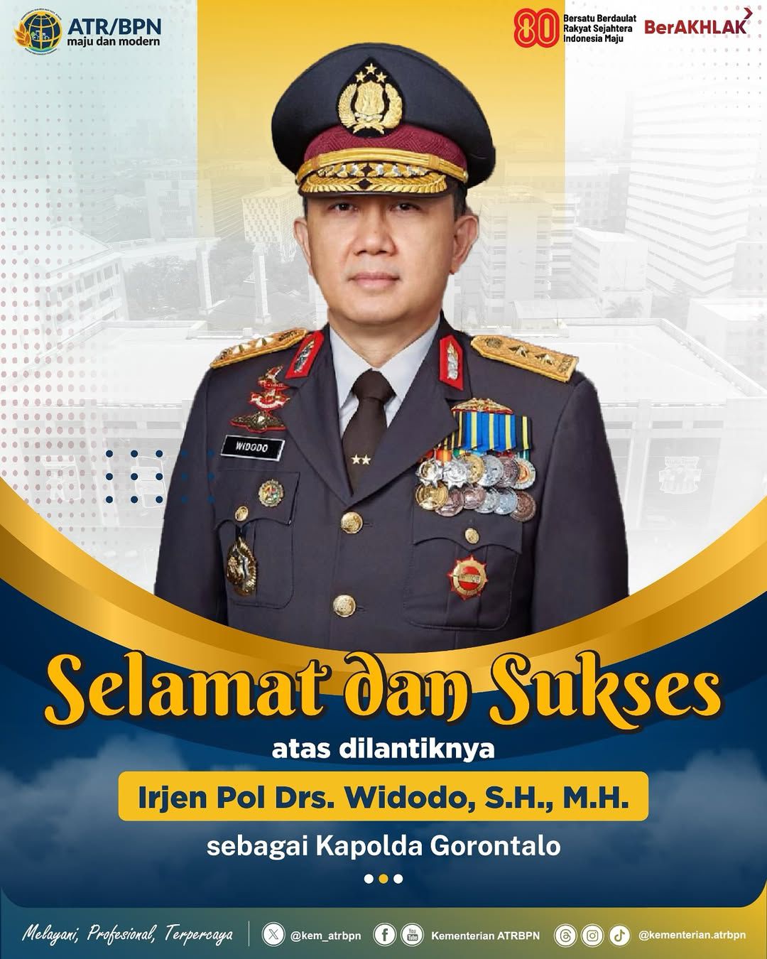 Segenap jajaran Kementerian ATR/BPN Mengucapkan Selamat dan Sukses atas dilantiknya Inspektur Jenderal Polisi Widodo sebagai Kepala Kepolisian Daerah Provinsi Gorontalo.