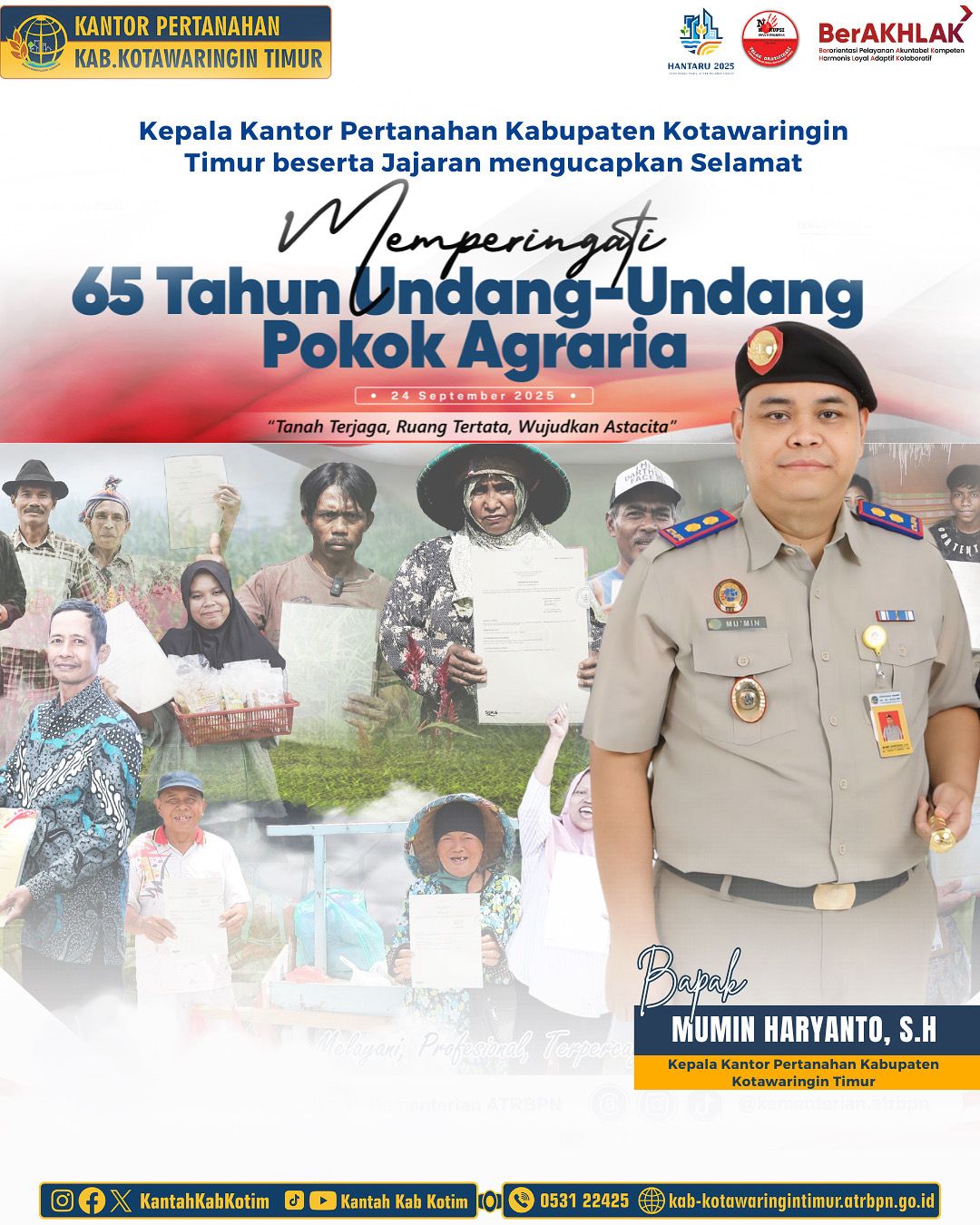 Segenap Keluarga besar Kantor Pertanahan Kabupaten Kotawaringin Timur mengucapkan Selamat Memperingati Hari Agraria dan Tata Ruang Nasional Tahun 2025