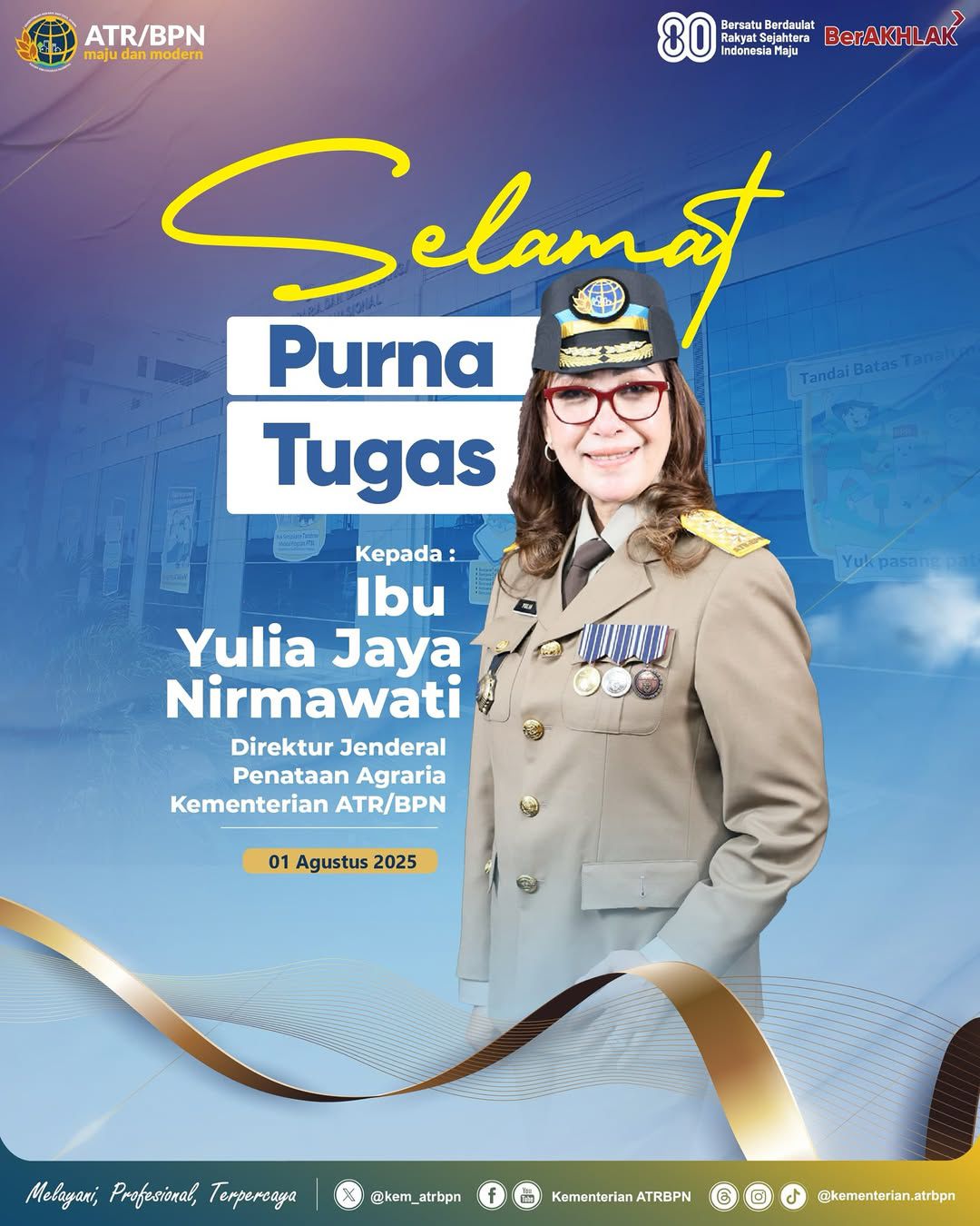 Segenap keluarga besar Kementerian ATR/BPN mengucapkan Selamat Purna Tugas Ibu Direktur Jenderal Penataan Agraria, Yulia Jaya Nirmawati.