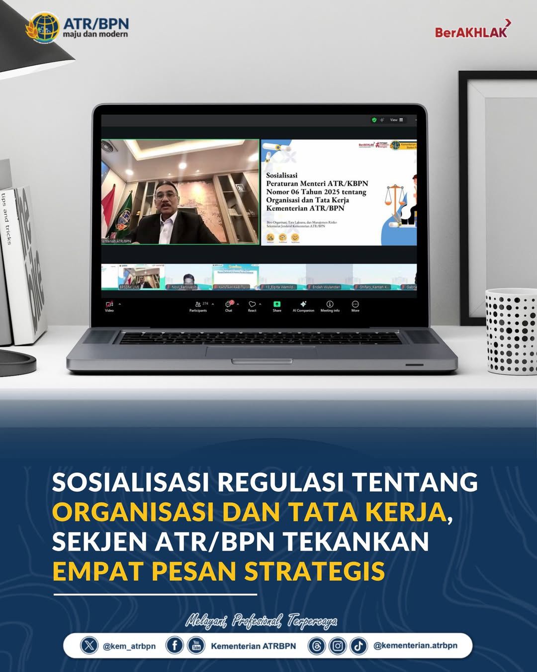 Halo #SobATRBPN, Sekretaris Jenderal Kementerian Agraria dan Tata Ruang/Badan Pertanahan Nasional, Dalu Agung Darmawan, menekankan empat pesan strategis kepada jajaran pusat dan daerah dalam Webinar Nasional Sosialisasi Peraturan Menteri ATR/Kepala BPN Nomor 6 Tahun 2025 tentang Organisasi dan Tata Kerja Kementerian ATR/BPN, Kamis (12/03/2026).