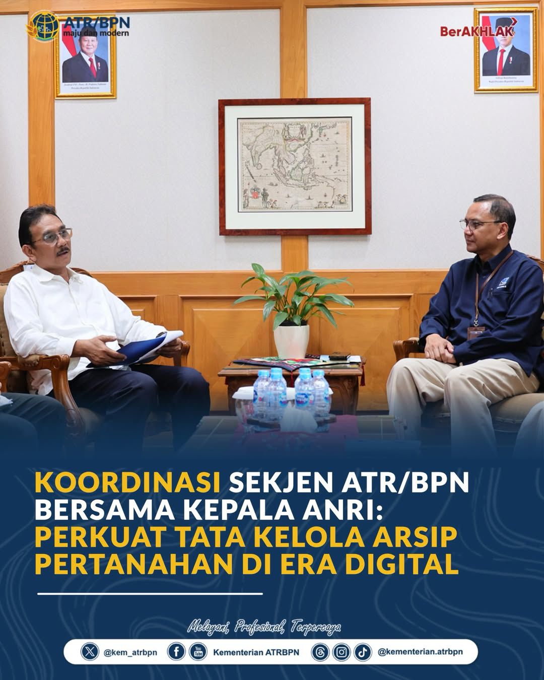 Halo #SobATRBPN, Sekretaris Jenderal Kementerian ATR/BPN, Dalu Agung Darmawan, berkoordinasi dengan Kepala Arsip Nasional Republik Indonesia (ANRI), Mego Pinandito, di Jakarta, Rabu (25/02/2026). Pertemuan ini membahas penguatan tata kelola arsip pertanahan sebagai fondasi pelayanan dan penjaga aset masyarakat di era digital.