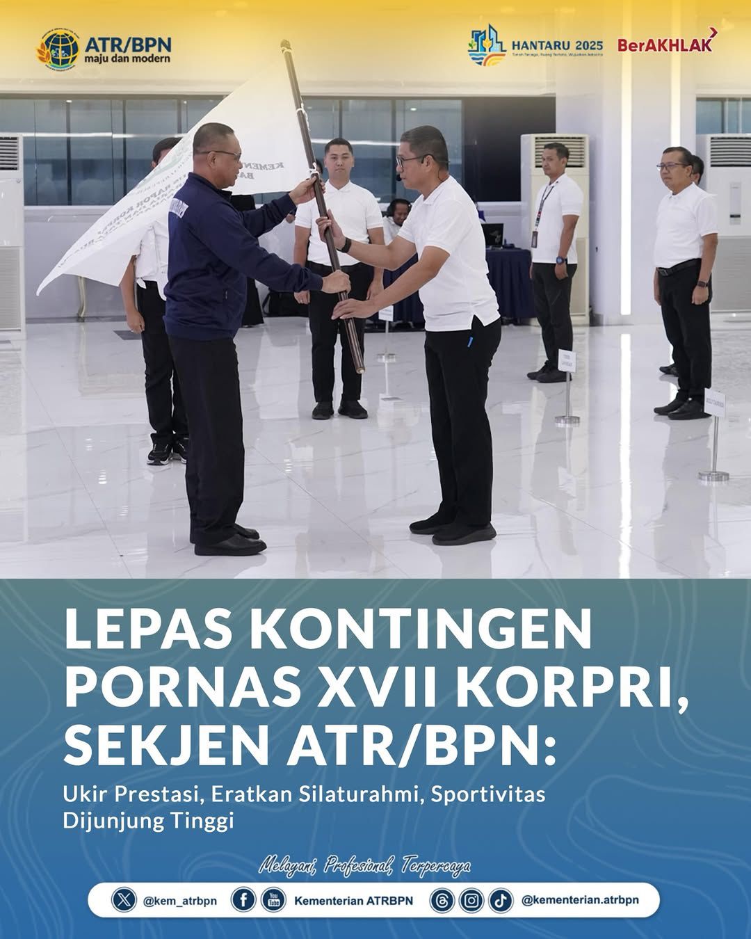 Sekretaris Jenderal (Sekjen) Kementerian Agraria dan Tata Ruang/Badan Pertanahan Nasional (ATR/BPN), Pudji Prasetijanto Hadi, secara resmi melepas kontingen Kementerian ATR/BPN yang akan berlaga dalam Pekan Olahraga Nasional (PORNAS) Korps Pegawai Republik Indonesia (KORPRI) XVII Tahun 2025 di Sumatra Selatan. Dalam sambutannya, ia menegaskan pentingnya momentum PORNAS sebagai ajang mengukir prestasi sekaligus sarana mempererat silaturahmi antar pegawai.