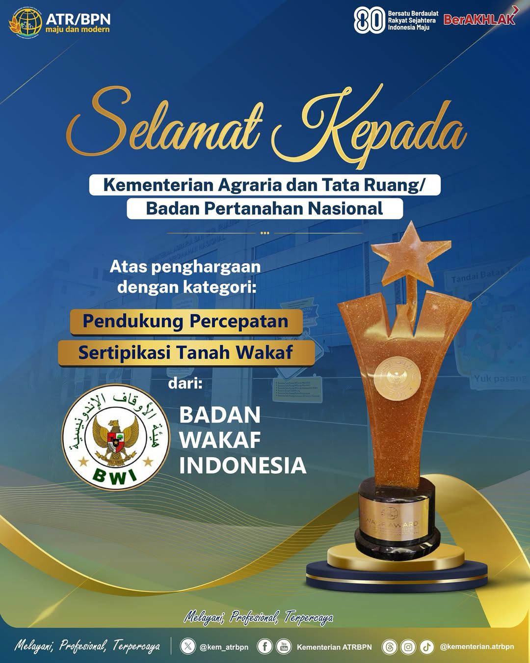 Selamat kepada Kementerian ATR BPN atas penghargaan dengan kategori Pendukung Percepatan Sertipikasi Tanah Wakaf dari Badan Wakaf Indonesia.