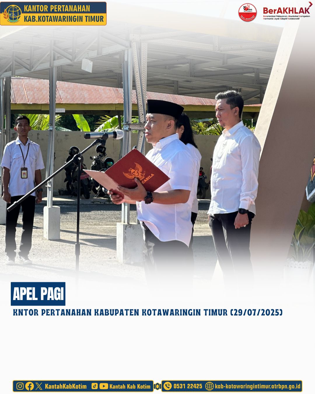 Telah dilaksanakan Apel Pagi Rutin yang di pimpin langsung oleh Bapak Lutfi Maulana Marga Yuwana, S.ST. selaku Kasubab Bagian Tata Usaha dengan di ikuti oleh seluruh pegawai Kantor Pertanahan Kabupaten Kotawaringin Timur.