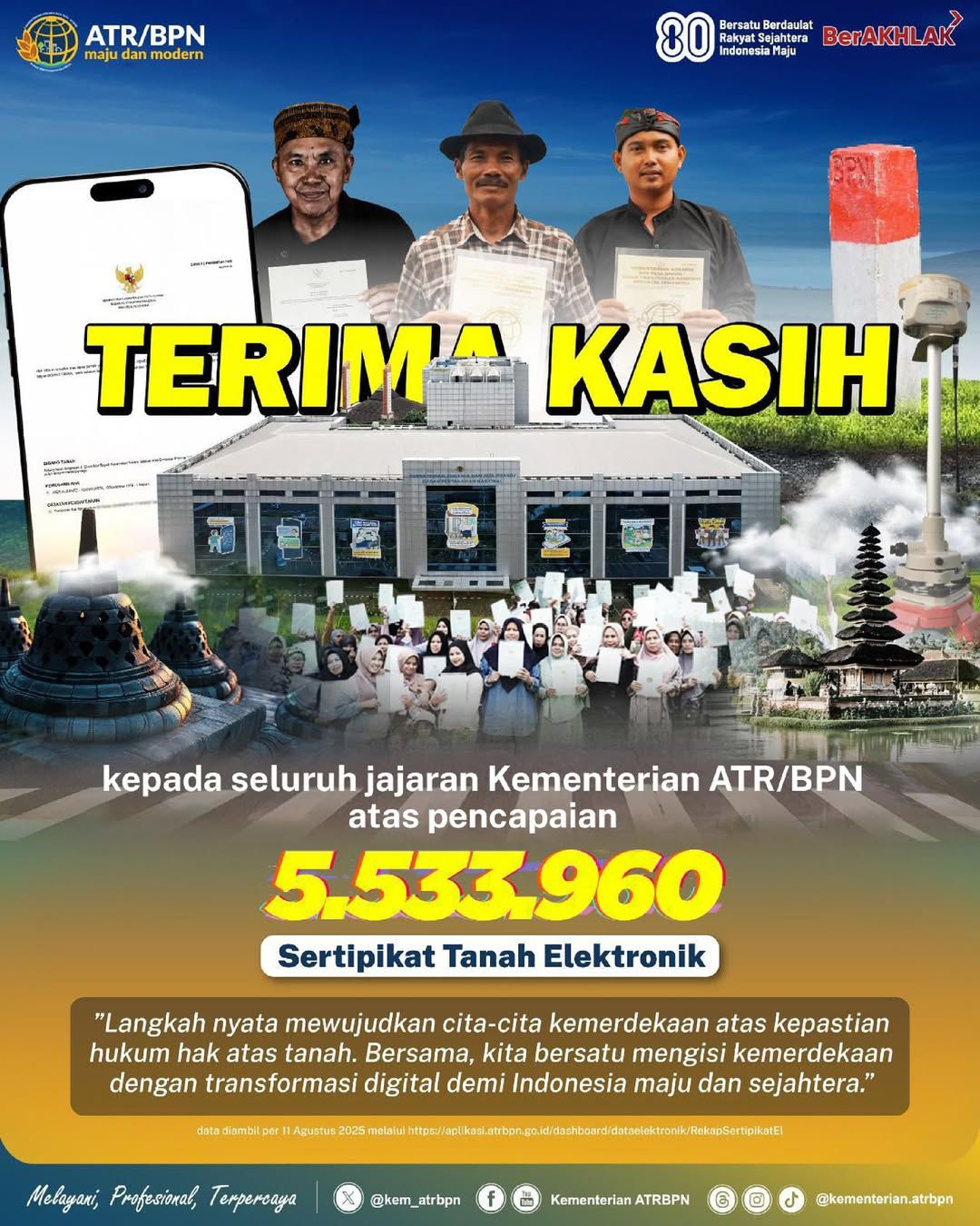 Terima kasih kepada seluruh insan pertanahan dan tata ruang atas pencapaian 5.533.960 Sertipikat Elektronik.