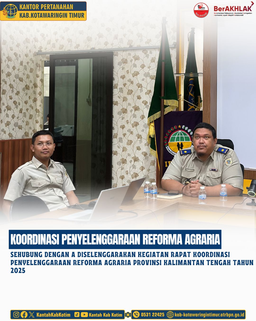 Sehubung dengan a diselenggarakan kegiatan rapat Koordinasi Penyelenggaraan Reforma Agraria Provinsi Kalimantan Tengah Tahun 2025 sebagaimana keputusan Gubernur Kalimantan Tengah Nomor 188.44/201/2025 tentang tim gugus Tugas Reforma Agraria Provinsi Kalimantan Tengah Tahun 2025 yang dilaksanakan di Aula Kantor Wilayah BPN Provinsi Kalimantan Tengah dan diikuti langsung oleh Kepala Seksi Penataan dan Pemberdayaan kantor Pertanahan Kabupaten Kotawaringin Timur melalui Zoom Meeting.