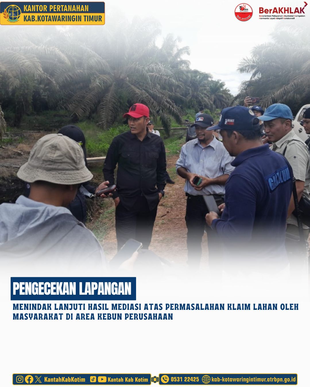 Tim Kantor Pertanahan Kabupaten Kotawaringin Timur bersama Pemerintah Daerah Kabupaten Kotawaringin Timur dan Stake Holder tekait Malakukan Pengecekan Lapangan menindak lanjuti hasil mediasi atas permasalahan klain lahan oleh Masyarakat di area Kebun perusahaan yang ada di Kabupaten Kotawaringin Timur