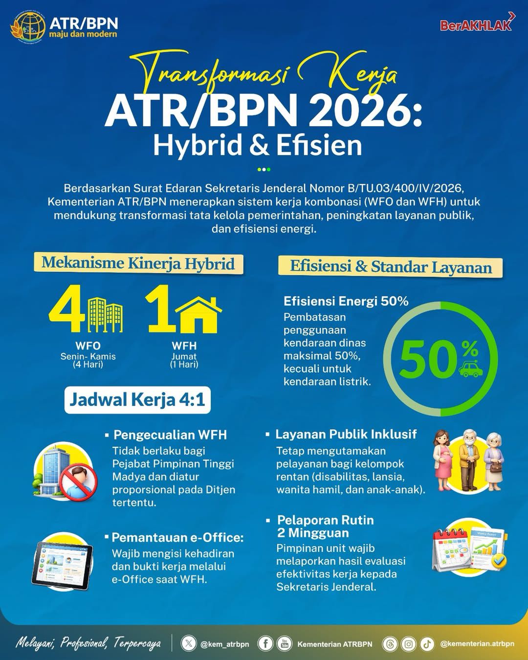 Halo #SobATRBPN, transformasi kerja terus bergerak, melalui sistem kerja Hybrid & Efisien, Kementerian ATR/BPN menghadirkan pola kerja yang lebih adaptif dengan skema 4 hari Work From Office (WFO) dan 1 hari Work From Home (WFH).