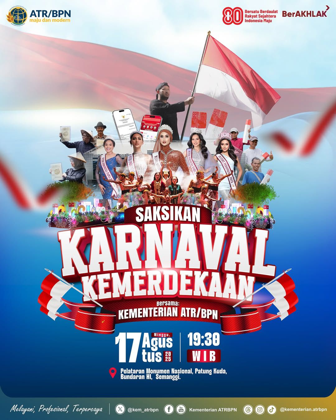 Halo #SobATRBPN, undangan bagi kamu semua untuk hadir dalam puncak perayaan Hari Ulang Tahun ke-80 Republik Indonesia pada Pesta Rakyat dan Karnaval Kemerdekaan bersama Kementerian ATR/BPN.