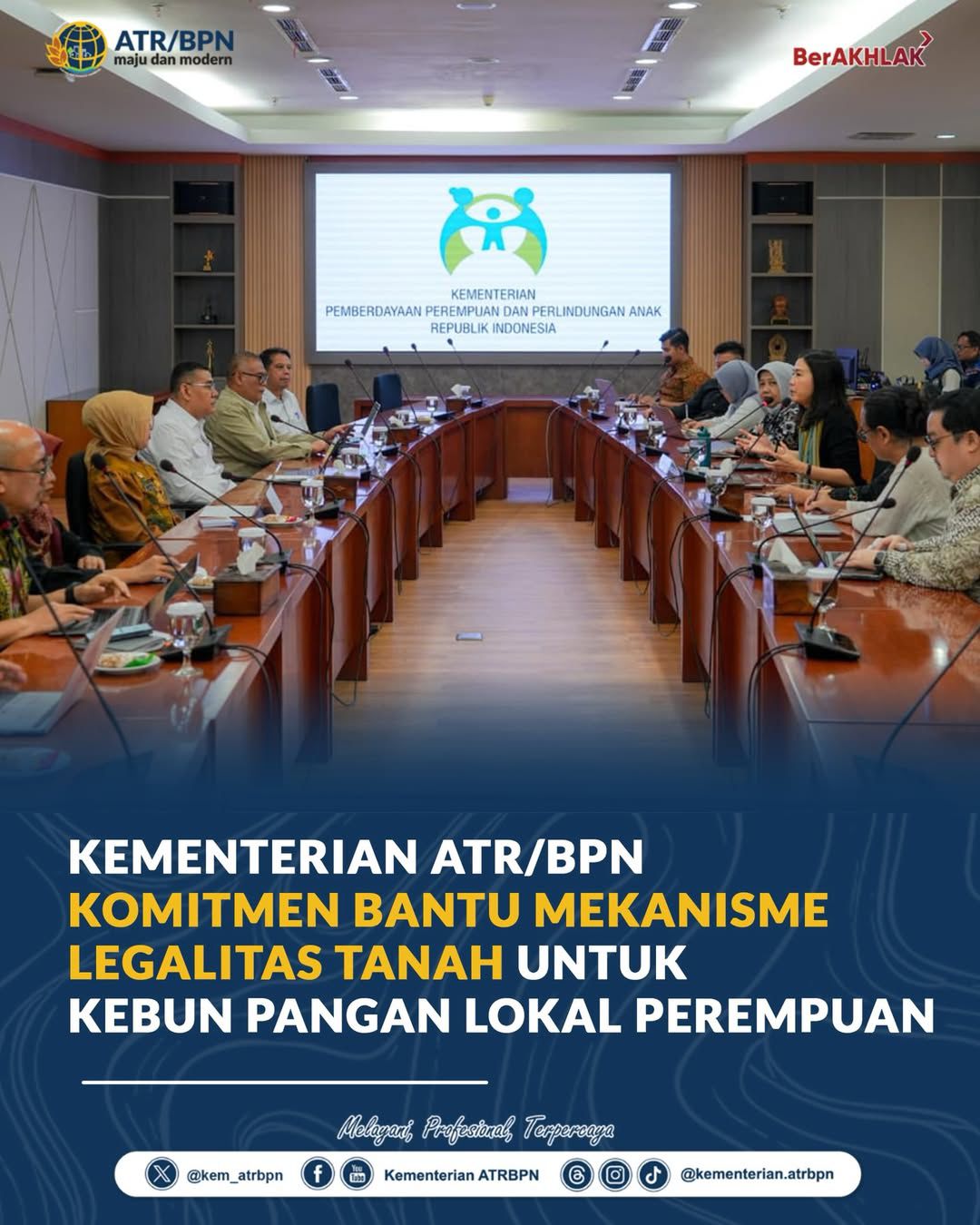 Halo #SobATRBPN, Wakil Menteri Agraria dan Tata Ruang/Wakil Kepala BPN, Ossy Dermawan, menegaskan komitmen Kementerian ATR/BPN dalam mendukung program Kebun Pangan Lokal Perempuan (KPLP) yang diinisiasi oleh Kementerian Pemberdayaan Perempuan dan Perlindungan Anak. Dukungan ini difokuskan pada aspek penyediaan serta legalisasi tanah sebagai lokasi pelaksanaan program.