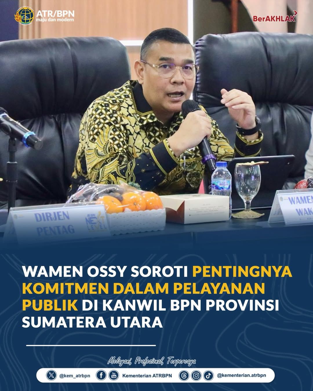 Halo #SobATRBPN, Wakil Menteri Agraria dan Tata Ruang/Wakil Kepala BPN, Ossy Dermawan, menekankan pentingnya peningkatan kualitas pelayanan pertanahan saat kunjungannya ke Kantor Wilayah BPN Provinsi Sumatera Utara, Kamis (02/04/2026). Wamen Ossy menegaskan bahwa pelayanan publik harus menjadi prioritas utama, dengan komitmen kuat untuk memberikan layanan terbaik kepada masyarakat.