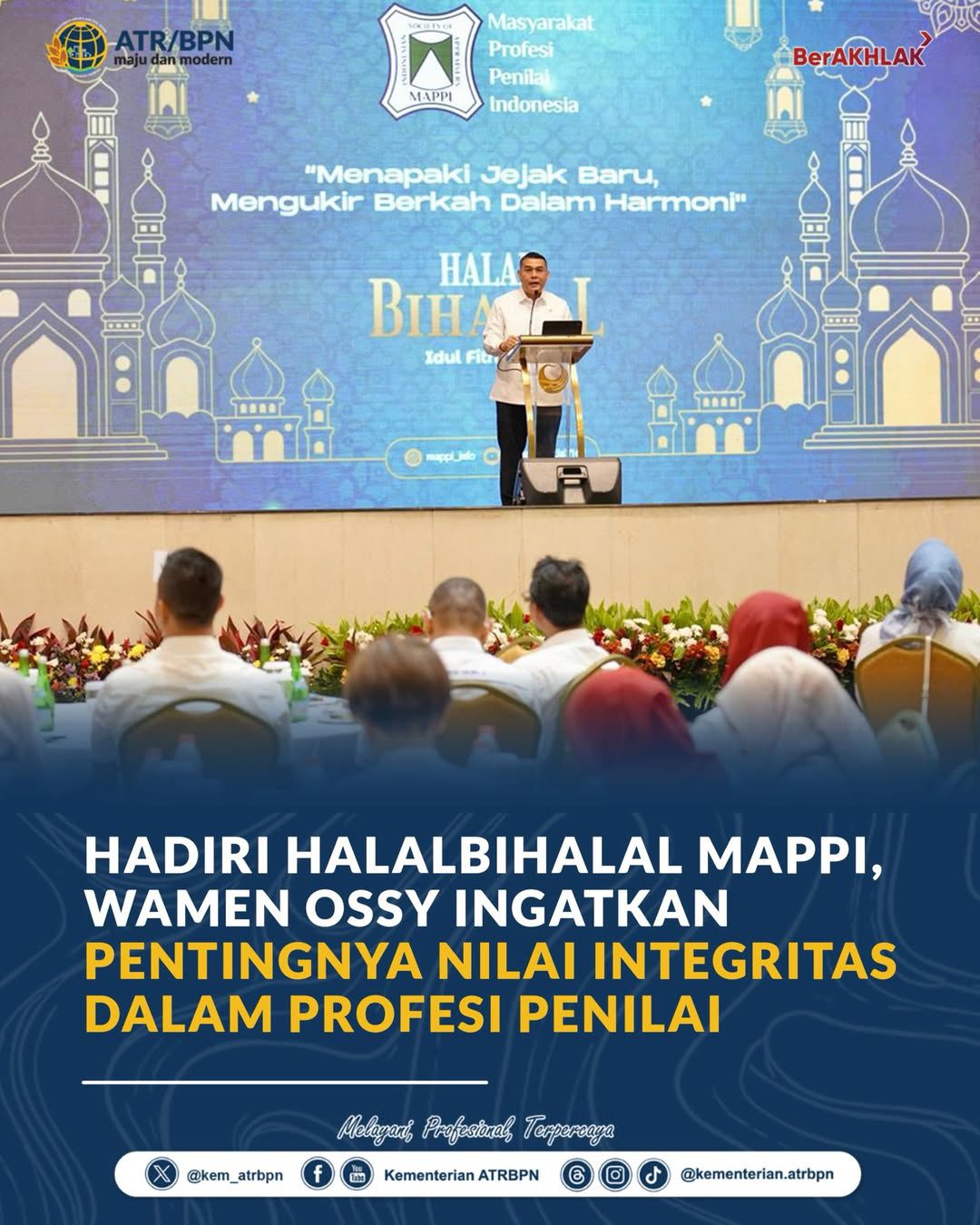 Halo #SobATRBPN, Wakil Menteri Agraria dan Tata Ruang/Wakil Kepala BPN, Ossy Dermawan, menghadiri acara halalbihalal yang diselenggarakan oleh Masyarakat Profesi Penilai Indonesia dalam rangka Idulfitri 1447 H di Jakarta, Rabu (08/04/2026). Dalam kesempatan tersebut, ia menekankan pentingnya menjaga nilai integritas dalam menjalankan profesi penilai.