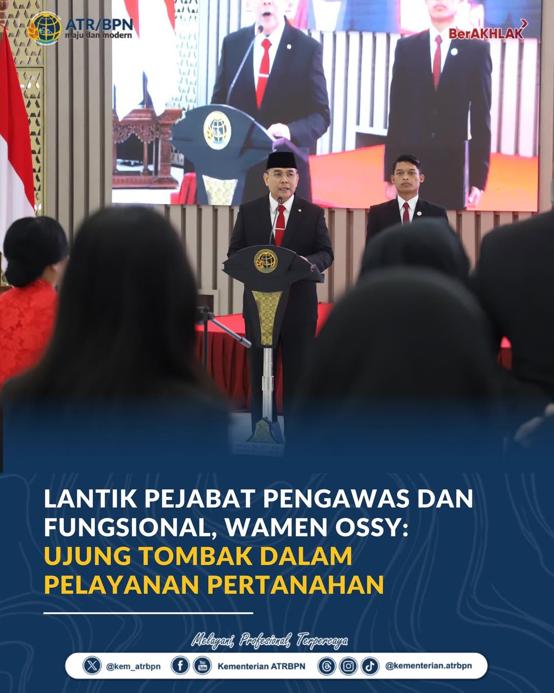 Halo #SobATRBPN, Wakil Menteri ATR/Wakil Kepala BPN, Ossy Dermawan, melantik Pejabat Pengawas dan Pejabat Fungsional di Kementerian Agraria dan Tata Ruang/Badan Pertanahan Nasional, Jakarta, Kamis (12/03/2026). Dalam kesempatan tersebut, ia menegaskan bahwa para pejabat yang dilantik memiliki peran penting sebagai ujung tombak dalam memastikan kualitas pelayanan pertanahan kepada masyarakat.